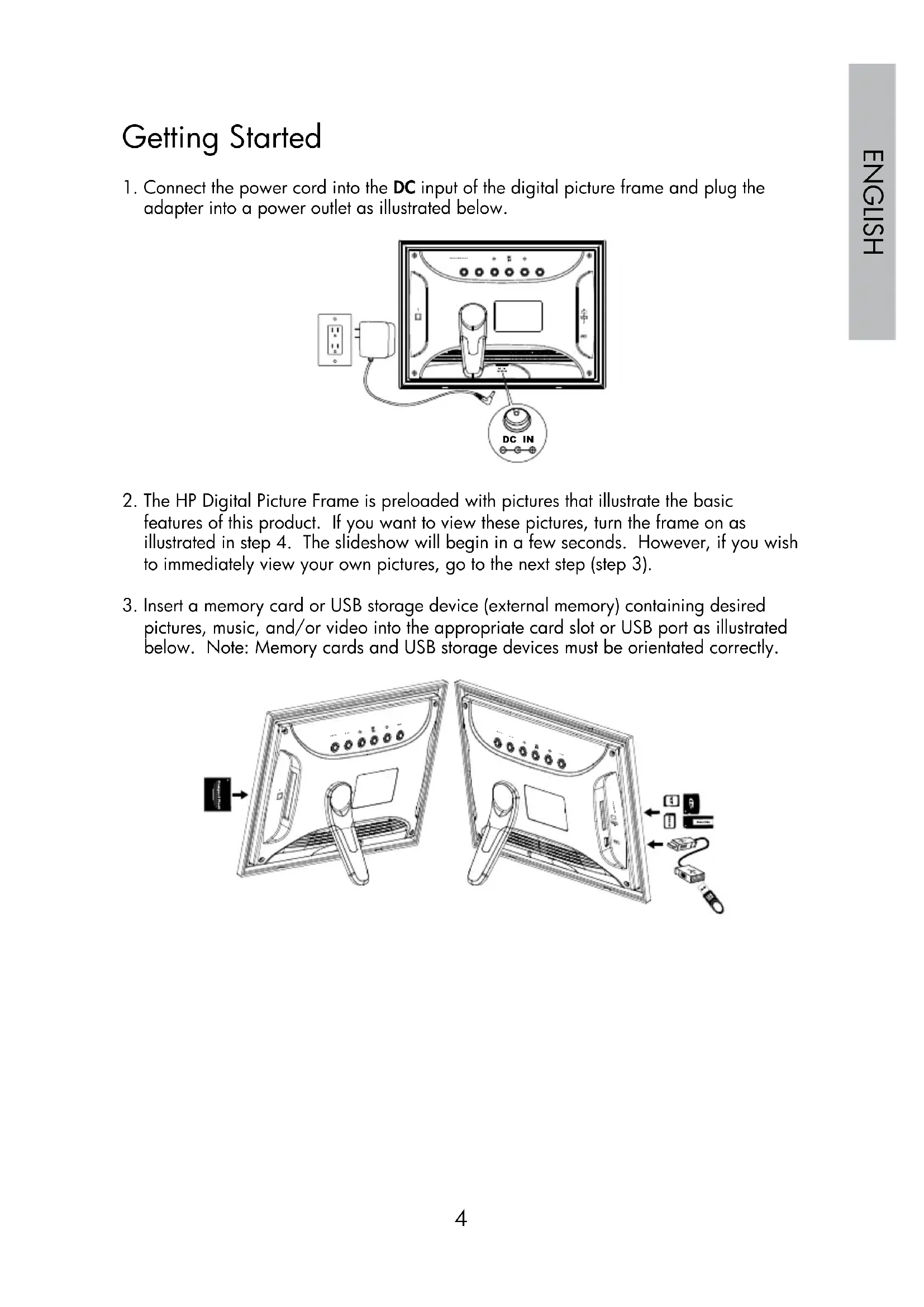 features of this product. If you want to view these pictures, turn the frame on as illustrated in step 4. The slideshow will begin in a few seconds. However, if you wish to immediately view your own pictures, go to the next step (step 3).