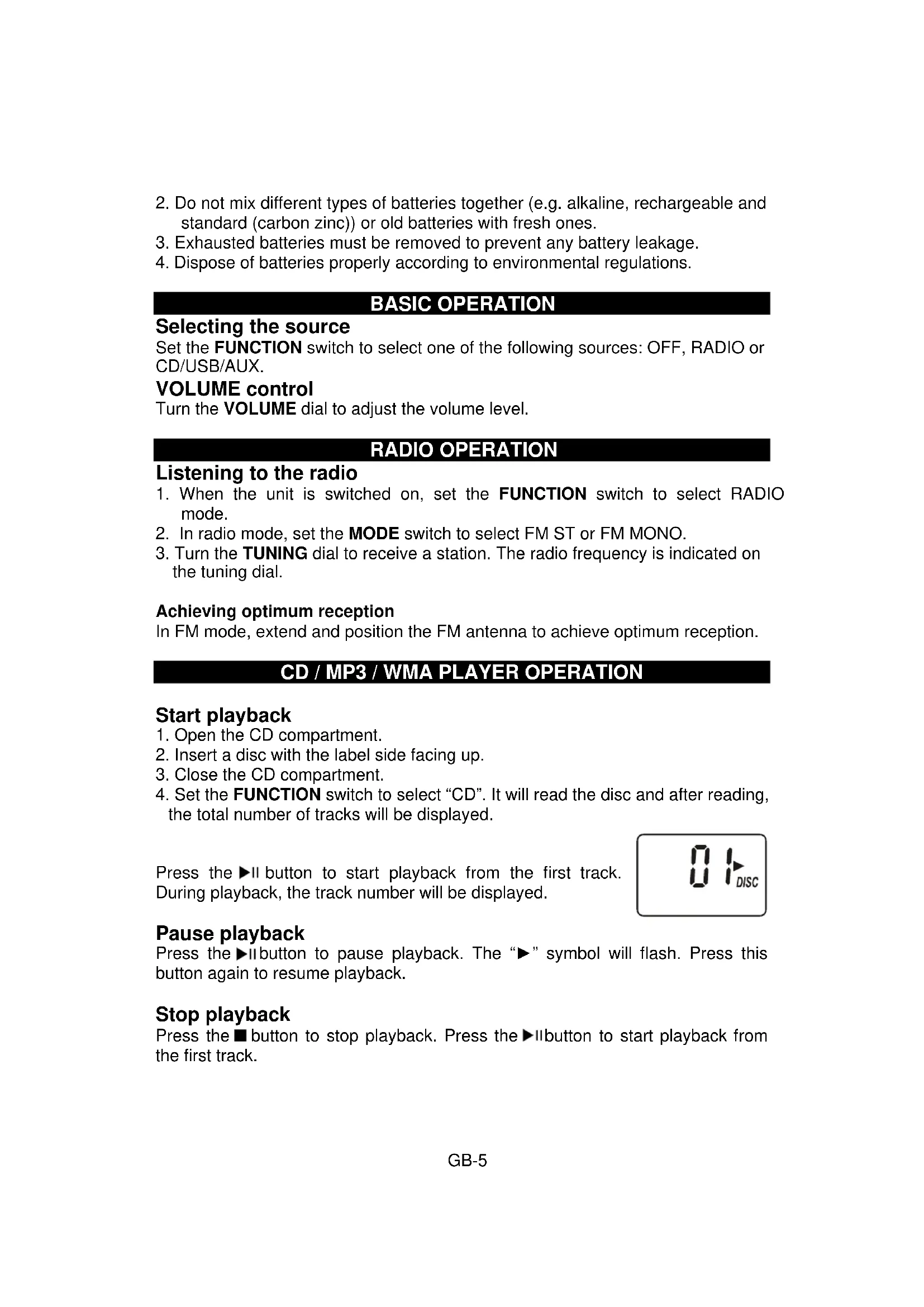 Insert a USB device into the USB port. When the unit is switched on, set the FUNCTION switchto select the “CD/USB” mode. In stop mode, press the button to select “USB” mode. Refer to “CD/ MP3 / WMA PLAYER OPERATION” to play MP3/ WMA files.GB-7 Note: Due to technical differences, some models of USB storage devices or MP3 players may take longer to be read. In some cases, they may not even be read. USB stick should be direct connected or with a cable with max. 0.5 m length.