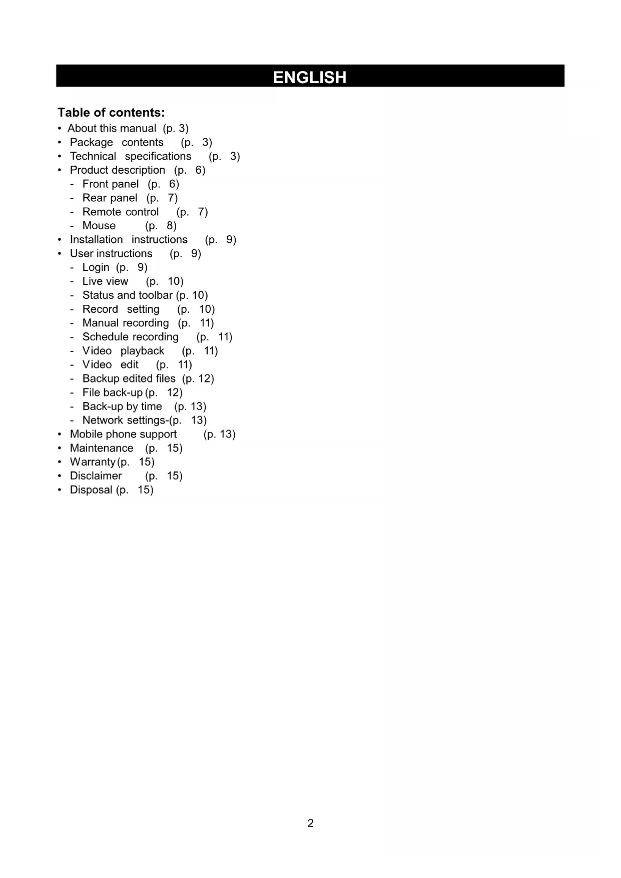 - Disposal (p. 15)3 About this manual This manual describes the operation and installation of the digital video recorder (DVR) and the cameras. Please refer to the extensive English manual for further details about the DVR.