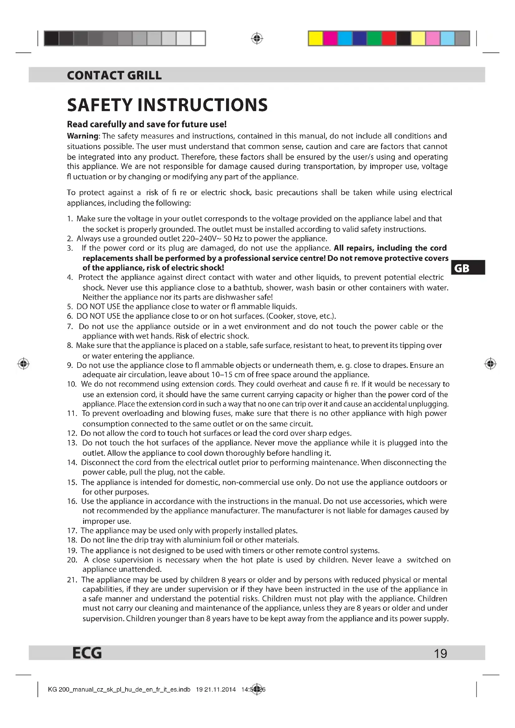 Wrapping paper and corrugated paperboard – deliver to scrapyard. Packing foil, PE bags, plastic elements – throw into plastic recycling containers. DISPOSAL OF PRODUCTS AT THE END OF LIFETIME Disposal of electric and electronic equipment (valid in EU member countries and other European countries with an implemented recycling system) The represented symbol on the product or package means the product shall not be treated as domestic waste. Hand over the product to the speci ed location for recycling electric and electronic equipment. Prevent negative impacts on human health and the environment by properly recycling your product. Recycling contributes to preserving natural resources. For more information on the recycling of this product, refer to your local authority, domestic waste processing organization or store, where you purchased the product. This product complies with EU directive requirements on electromagnetic compatibility and electrical safety. The instruction manual is available at website www.ecg.cz. Changes in text and technical parameters reserved. 08/05KG 200_manual_cz_sk_pl_hu_de_en_fr_it_es.indb 21 21.11.2014 14:53:27FR GRILL À CONTACT