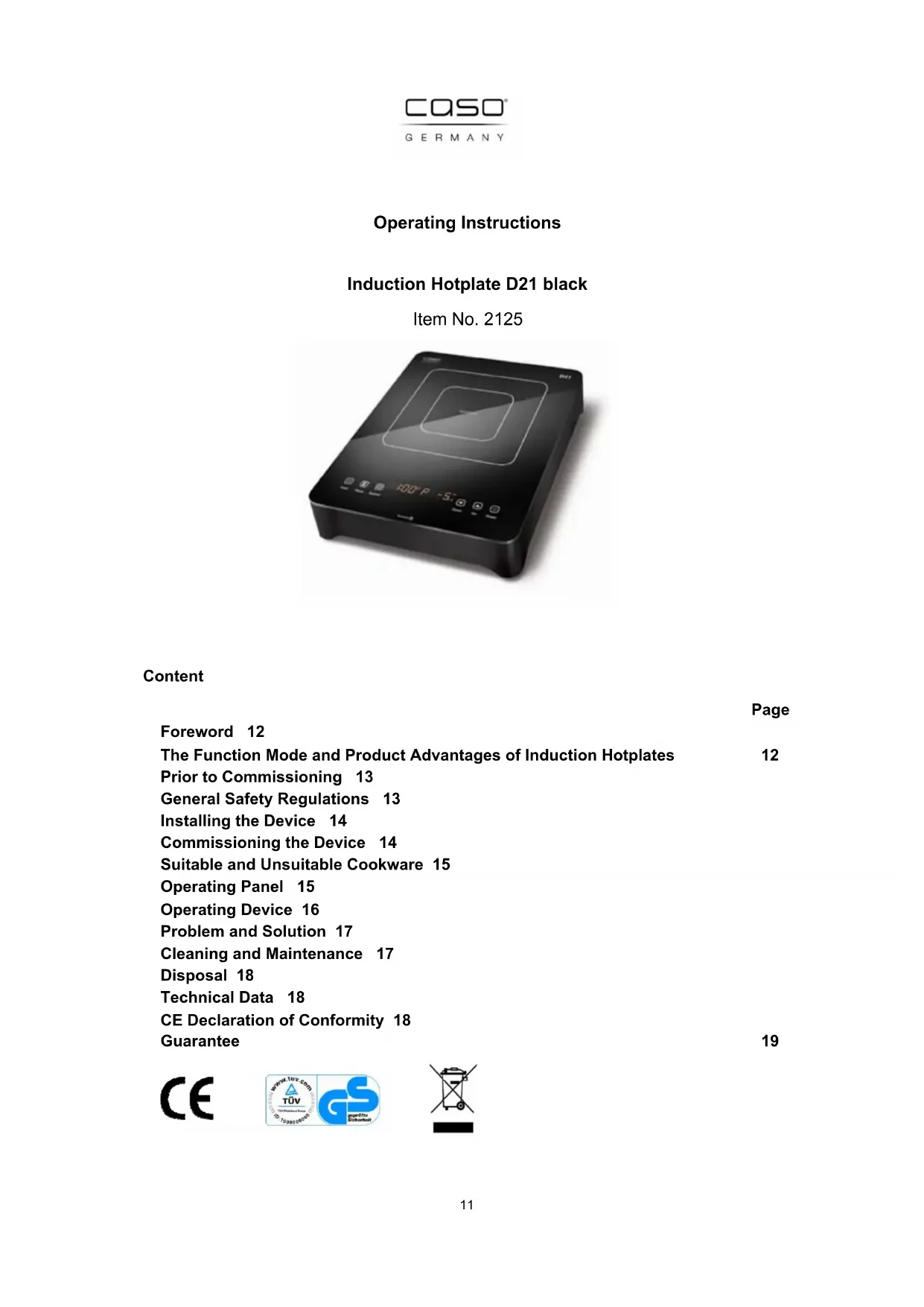 Content Page Foreword 12 The Function Mode and Product Advantages of Induction Hotplates 12 Prior to Commissioning 13 General Safety Regulations 13 Installing the Device 14 Commissioning the Device 14 Suitable and Unsuitable Cookware 15 Operating Panel 15 Operating Device 16 Problem and Solution 17 Cleaning and Maintenance 17 Disposal 18 Technical Data 18 CE Declaration of Conformity 18 Guarantee 1912