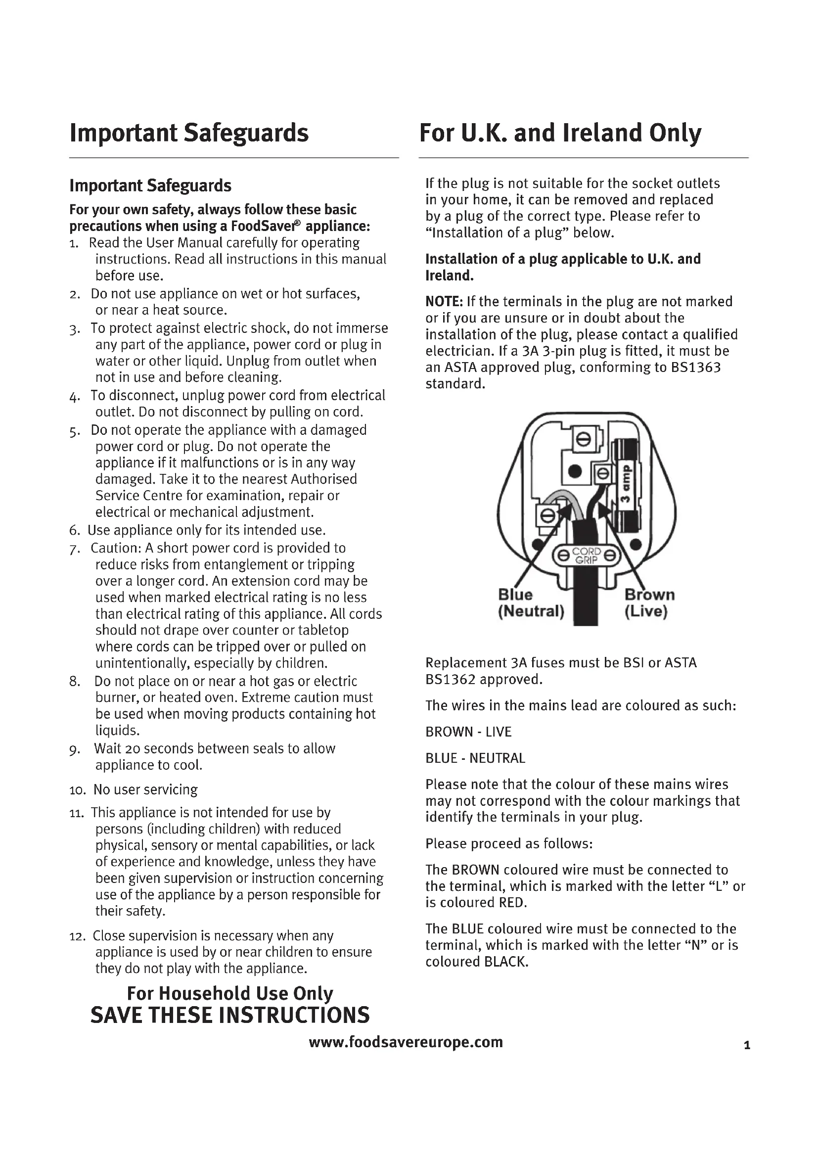 If the plug is not suitable for the socket outlets in your home, it can be removed and replaced by a plug of the correct type. Please refer to “Installation of a plug” below.Installation of a plug applicable to U.K. and Ireland.NOTE: If the terminals in the plug are not marked or if you are unsure or in doubt about the installation of the plug, please contact a qualified electrician. If a 3A 3-pin plug is fitted, it must be an ASTA approved plug, conforming to BS1363 standard. Replacement 3A fuses must be BSI or ASTA BS1362 approved.The wires in the mains lead are coloured as such:BROWN - LIVEBLUE - NEUTRALPlease note that the colour of these mains wires may not correspond with the colour markings that identify the terminals in your plug.Please proceed as follows:The BROWN coloured wire must be connected to the terminal, which is marked with the letter “L” or is coloured RED.The BLUE coloured wire must be connected to the terminal, which is marked with the letter “N” or is coloured BLACK. Important Safeguards For U.K. and Ireland Onlywww.foodsavereurope.com