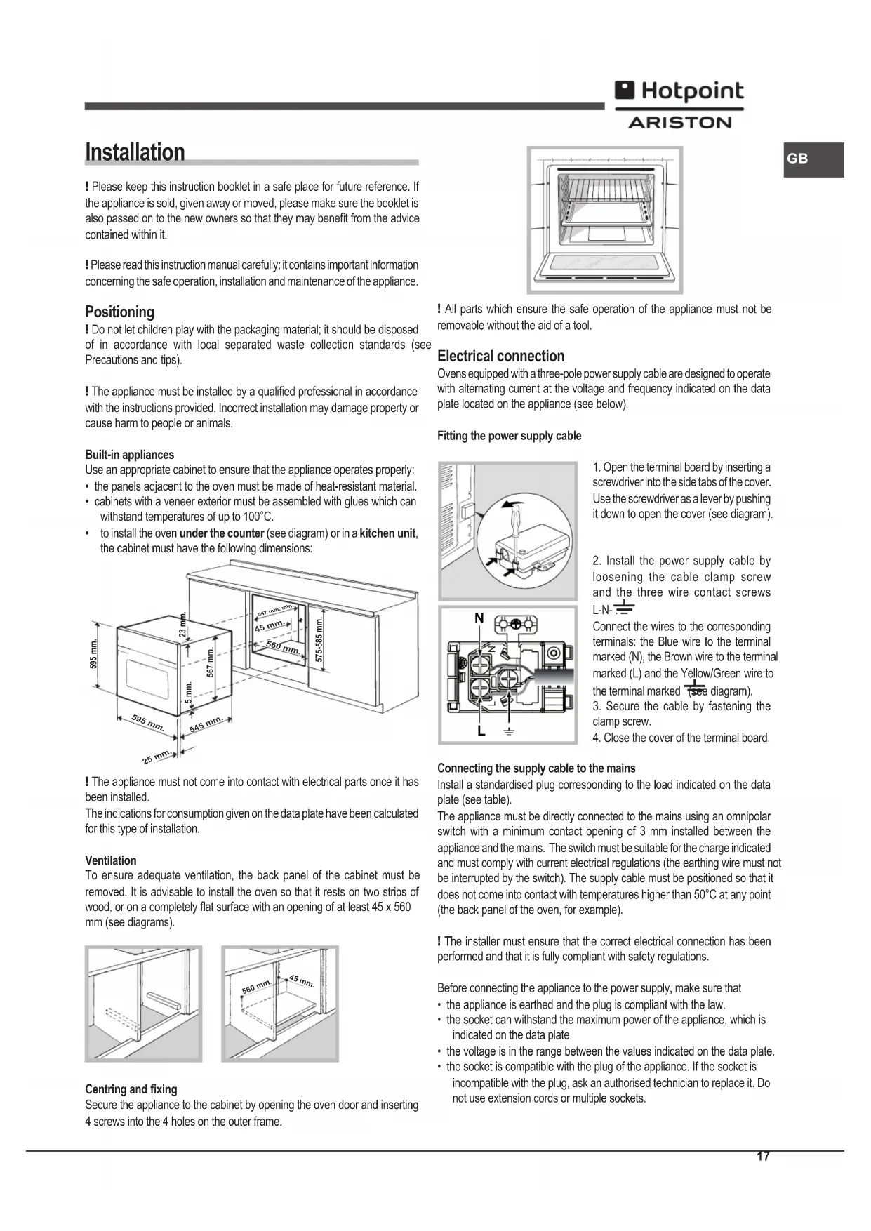 - to install the oven under the counter (see diagram) or in a kitchen unit, the cabinet must have the following dimensions: 595 mm.595 mm.25 mm.545 mm.5 mm.567 mm.23 mm.575-585 mm.45 mm.560 mm. 547 mm. min. ! The appliance must not come into contact with electrical parts once it has been installed. The indications for consumption given on the data plate have been calculated for this type of installation. Ventilation To ensure adequate ventilation, the back panel of the cabinet must be removed. It is advisable to install the oven so that it rests on two strips of wood, or on a completely at surface with an opening of at least 45 x 560 mm (see diagrams). 560 mm. 45 mm. Centring and xing Secure the appliance to the cabinet by opening the oven door and inserting 4 screws into the 4 holes on the outer frame. ! All parts which ensure the safe operation of the appliance must not be removable without the aid of a tool. Electrical connection Ovens equipped with a three-pole power supply cable are designed to operate with alternating current at the voltage and frequency indicated on the data plate located on the appliance (see below). Fitting the power supply cable