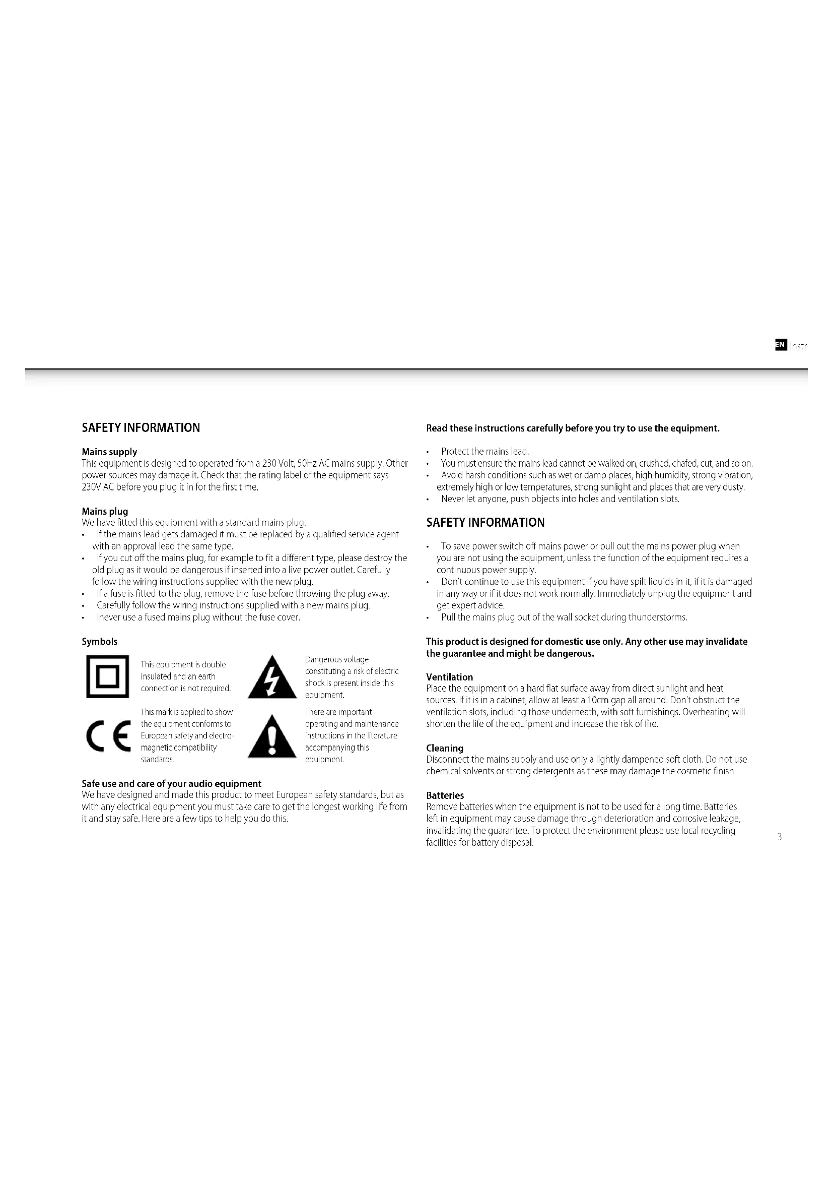 - Inever use a fused mains plug without the fuse cover. Symbols This equipment is double insulated and an earth connection is not required. Dangerous voltage constituting a risk of electric shock is present inside this equipment. This mark is applied to show the equipment conforms to European safety and electro- magnetic compatibility standards. There are important operating and maintenance instructions in the literature accompanying this equipment. Safe use and care of your audio equipment We have designed and made this product to meet European safety standards, but as with any electrical equipment you must take care to get the longest working life from it and stay safe. Here are a few tips to help you do this. Read these instructions carefully before you try to use the equipment.