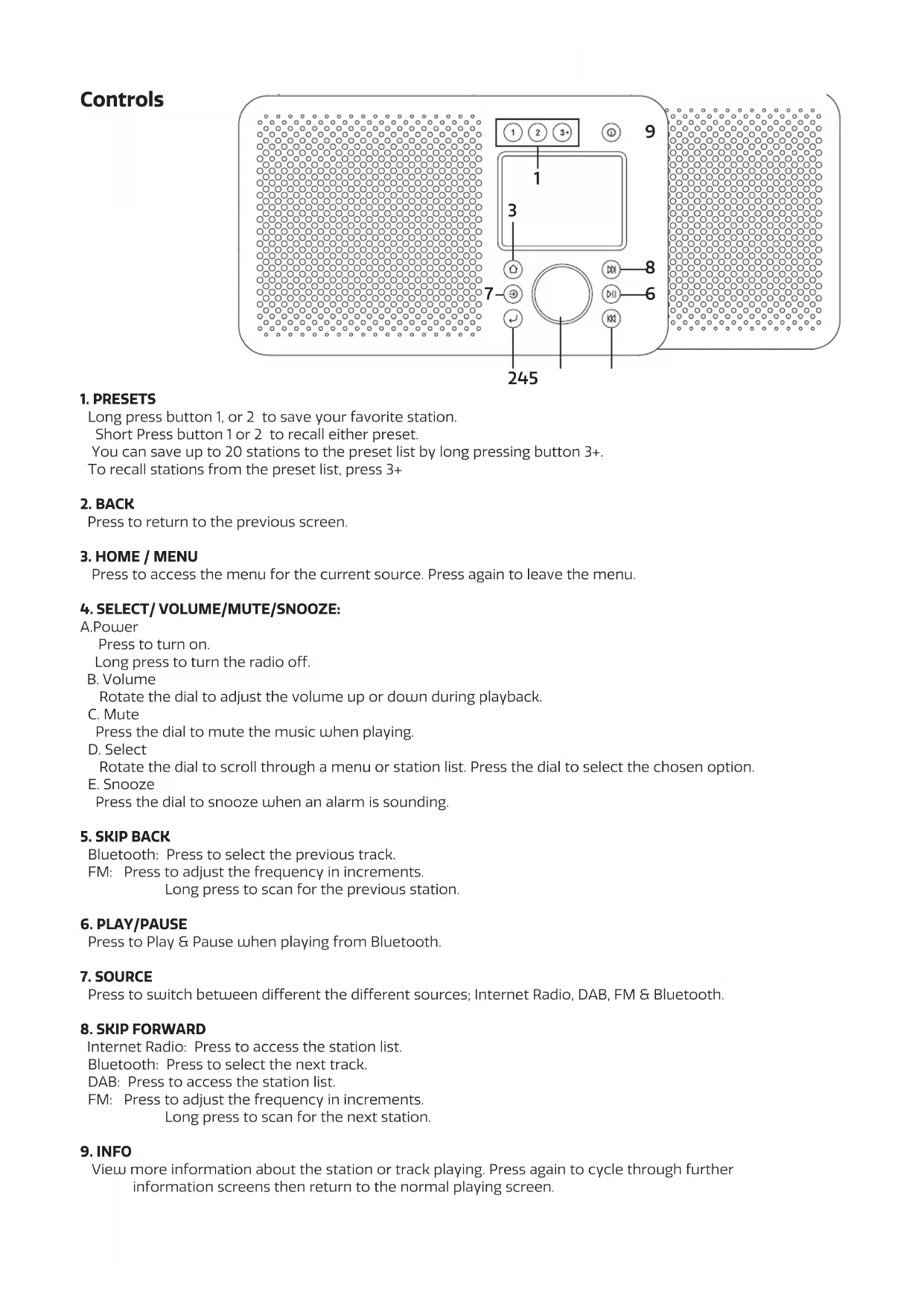 A. Power Press to turn on. Long press to turn the radio off. B. Volume Rotate the dial to adjust the volume up or down during playback. C. Mute Press the dial to mute the music when playing. D. Select Rotate the dial to scroll through a menu or station list. Press the dial to select the chosen option. E. Snooze Press the dial to snooze when an alarm is sounding.