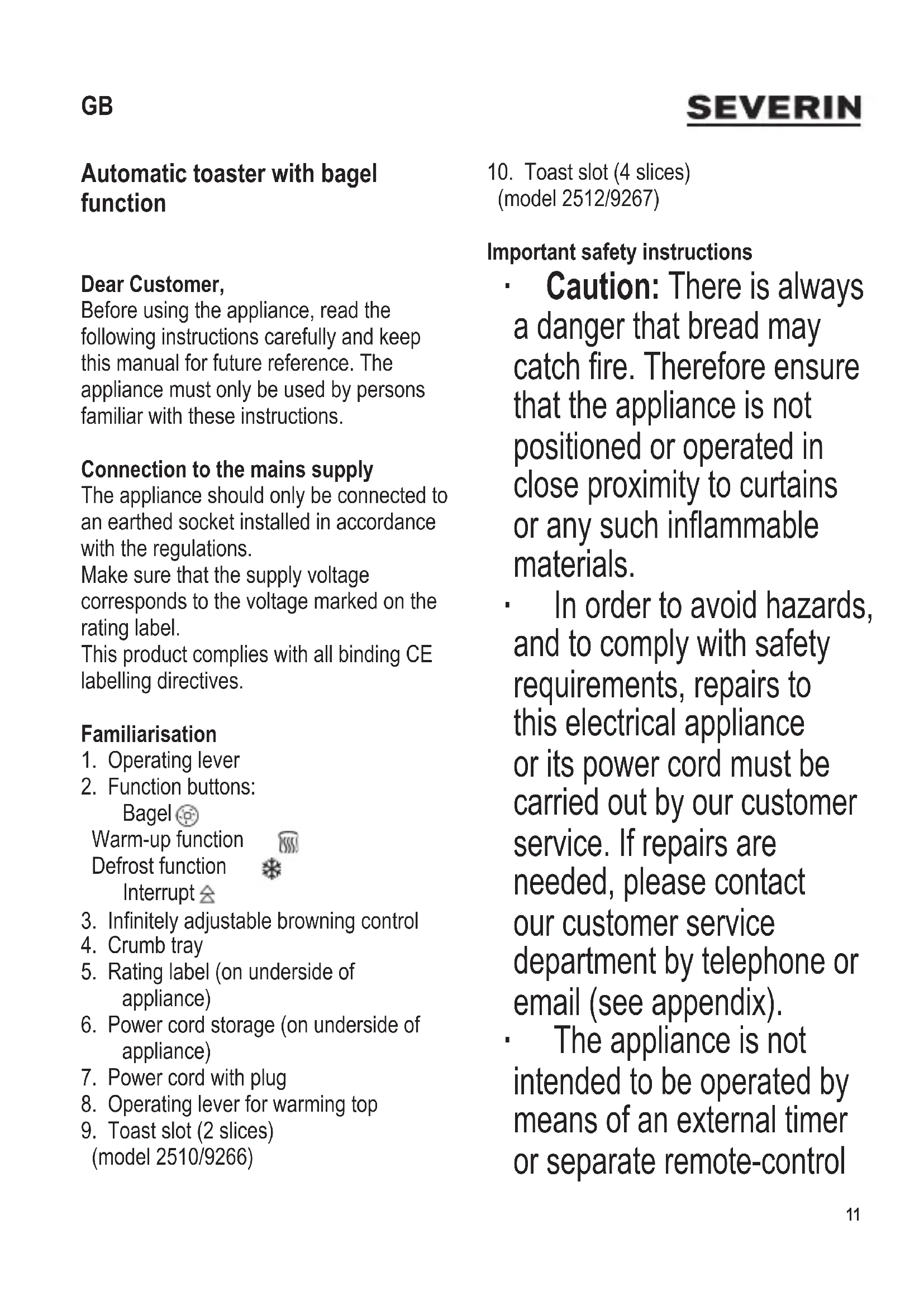 Automatic toaster with bagel function Dear Customer, Before using the appliance, read the following instructions carefully and keep this manual for future reference. The appliance must only be used by persons familiar with these instructions. Connection to the mains supply The appliance should only be connected to an earthed socket installed in accordance with the regulations. Make sure that the supply voltage corresponds to the voltage marked on the rating label. This product complies with all binding CE labelling directives. Familiarisation