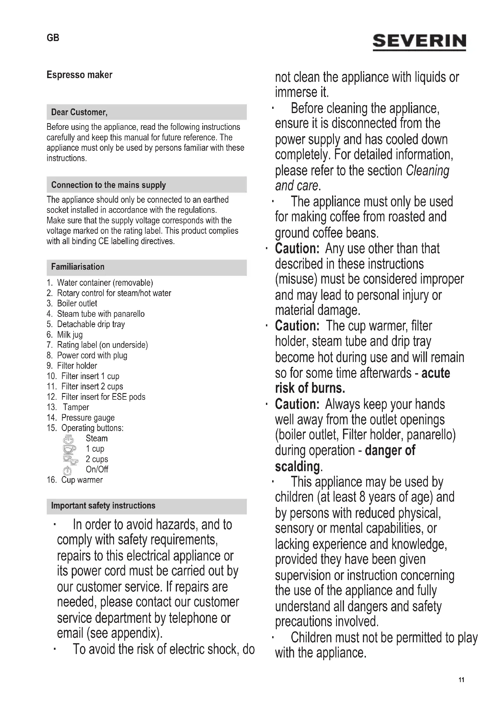 Important safety instructions ∙ In order to avoid hazards, and to comply with safety requirements, repairs to this electrical appliance or its power cord must be carried out by our customer service. If repairs are needed, please contact our customer service department by telephone or email (see appendix). ∙ To avoid the risk of electric shock, do not clean the appliance with liquids or immerse it. ∙ Before cleaning the appliance, ensure it is disconnected from the power supply and has cooled down completely. For detailed information, please refer to the section Cleaning and care. ∙ The appliance must only be used for making coffee from roasted and ground coffee beans. ∙ Caution: Any use other than that described in these instructions (misuse) must be considered improper and may lead to personal injury or material damage. ∙ Caution: The cup warmer, lter holder, steam tube and drip tray become hot during use and will remain so for some time afterwards - acute risk of burns. ∙ Caution: Always keep your hands well away from the outlet openings (boiler outlet, Filter holder, panarello) during operation - danger of scalding. ∙ This appliance may be used by children (at least 8 years of age) and by persons with reduced physical, sensory or mental capabilities, or lacking experience and knowledge, provided they have been given supervision or instruction concerning the use of the appliance and fully understand all dangers and safety precautions involved. ∙ Children must not be permitted to play with the appliance. GB12 142 x 208 mm ∙ Children must not be permitted to carry out any cleaning or maintenance work on the appliance unless they are supervised and at least 8 years of age. ∙ The appliance and its power cord must be kept well away from children under 8 at all times. ∙ The appliance must not be operated inside a closed cabinet. ∙ This appliance is intended for domestic or similar applications, such