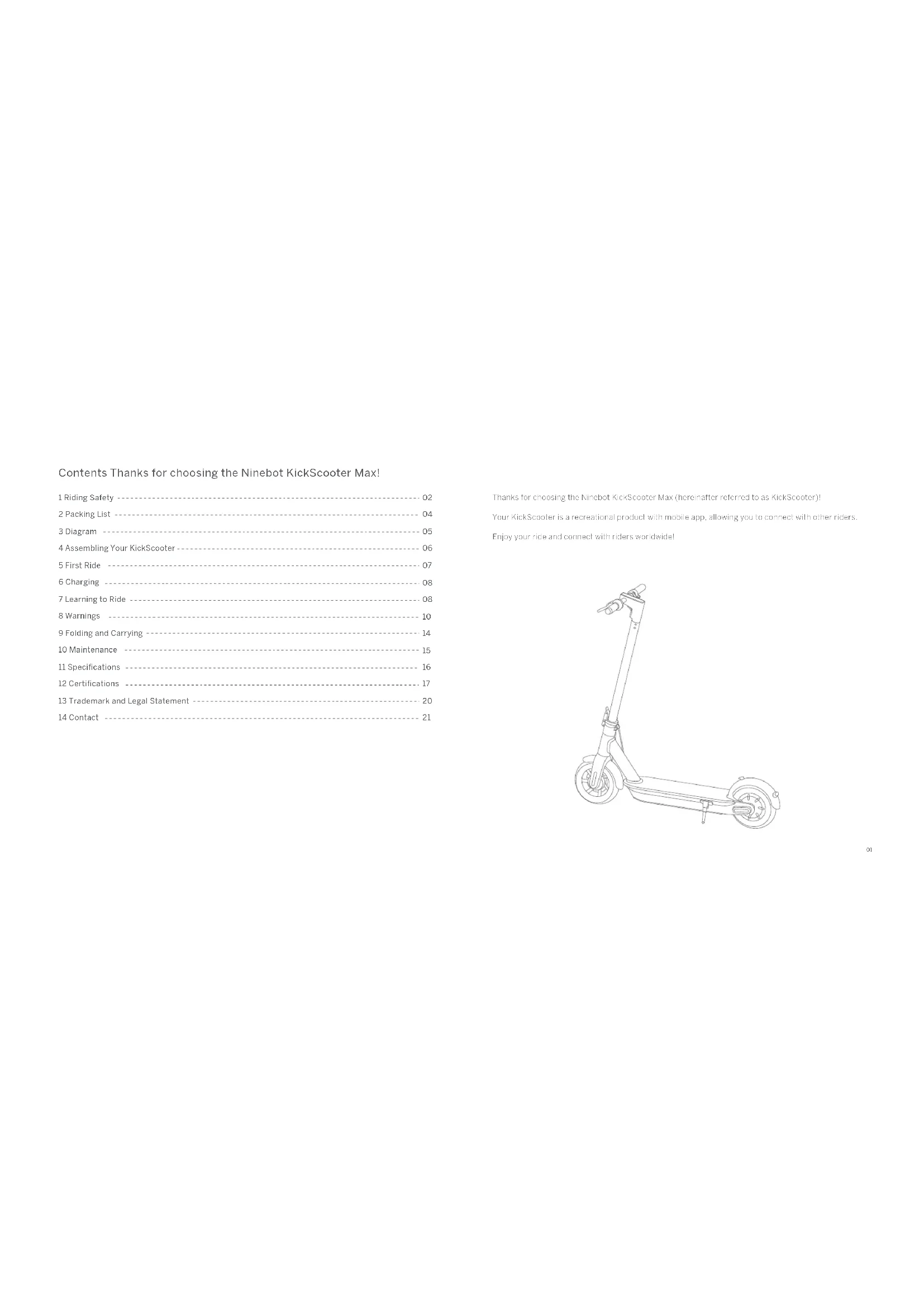 Certifications For model: G30 This product is certified to ANSI/CAN/UL-2272 by TUV Rheinland. The battery complies with UN/DOT 38.3. The battery complies with ANSI/UL 2271. Federal Communications Commission (FCC) Compliance Statement for USA This device complies with part 15 of the FCC rules. Operation is subject to the following two conditions: (1) This device may not cause harmful interference, and (2) this device must accept any interference received, including interference that may cause undesired operation. NOTE This equipment has been tested and found to comply with the limits for a Class B digital device, pursuant to part 15 of the FCC Rules. These limits are designed to provide reasonable protection against harmful interference in a residential installation. This equipment generates, uses and can radiate radio frequency energy and, if not installed and used in accordance with the instructions, may cause harmful interference to radio communications. However, there is no guarantee that interference will not occur in a particular installation. If this equipment does cause harmful interference to radio or television reception, which can be determined by turning the equipment off and on, the user is encouraged to try to correct the interference by one or more of the following measures: — Reorient or relocate the receiving antenna. — Increase the separation between the equipment and receiver. — Connect the equipment into an outlet on a circuit different from that to which the receiver is connected. — Consult the dealer or an experienced radio/TV technician for help. This equipment complies with FCC radiation exposure limits set forth for an uncontrolled environment. Industry Canada (IC) Compliance Statement for Canada This device complies with Industry Canada license-exempt RSS standard (s). Operation is subject to the following two conditions: (1) this device may not cause interference, and (2) this device must accept any interference, including interference that may cause undesired operation of the device. CAN ICES-3 (B)/NMB-3(B) “Le présent appareil est conforme aux CNR d'Industrie Canada applicables aux appareils radio exempts de licence. L'exploitation est autorisée aux deux conditions suivantes : (1) l'appareil ne doit pas produire de brouillage, et (2) l'utilisateur de l'appareil doit accepter tout brouillage radioélectrique subi, même si le brouillage est susceptible d'en compromettre le fonctionnement." Neither Segway Inc. nor Ninebot is responsible for any changes or modifications not expressly approved by Segway Inc. or Ninebot. Such modifications could void the user's authority to operate the equipment.