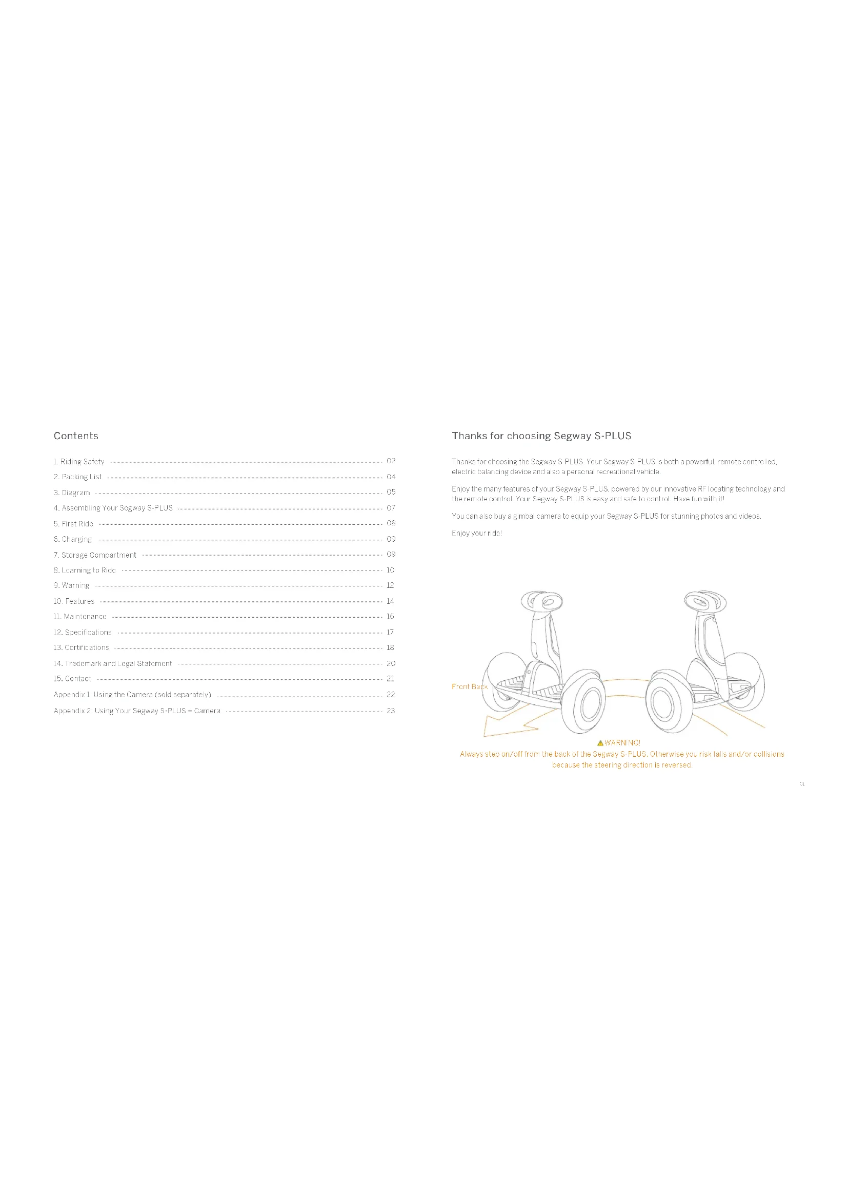 3 Diagram Dashboard When the App is connected to the Segway S-PLUS, this icon will glow steadily. When Bluetooth is enabled—but not connected to a smart phone—this icon will blink. Bluetooth Enable and adjust Speed Limit Mode via the App. When the icon is illuminated, Speed Limit Mode is on. This speed limit can be adjusted in the App. As you approach the speed limit, the Segway S-PLUS tilts back. When you reach the speed limit, the Segway S-PLUS beeps. Speed Limit Lock Power Button Turn ON/OFF. The Segway S-PLUS will automatically power OFF when idle for 10 minutes, or when laid down (horizontal) for over 30 seconds. Power Level Enable Lock Mode via the App. The Segway S-PLUS and app will vibrate and sound an alarm if anyone moves it. The remote control will also alarm if it is powered on and within range (65 ft. [20 meters]) of the Segway S-PLUS. Indicates the remaining battery life. Each block equates to approximately 20% power level. When the battery is nearly empty this icon blinks and the Segway S-PLUS beeps, indicating that you need to charge your Segway S-PLUS. Your Segway S-PLUS will gradually reduce the max speed limit as the power level gradually decreases. When less than 10%, the speed will be limited to 6.2 mph (10 km/h). Use the App to view the remaining power and estimated remaining range. Camera Interface Steering Bar Storage Compartment Handle and Knee Pads Charge Port Battery Cabin Valve Stem Foot Mat Wheel Light Wheel Fender Power Button Headlight Lock Bluetooth Speed Limit Power Level 2 Packing List Mainframe Steering Bar (RF locating system integrated) Valve Stem Extension x 1 M5 Screws x2 Cap x1 Hex Wrench x1 Remote Control x 1 User Materials Accessories Box Accessories in the Box When unpacking your Segway S-PLUS, please verify that the above items are included in the package. If you are missing any components, please contact your dealer/distributor or nearest service center (see contacts in the user manual). After verifying that all components are present and in good condition, you can assemble your new Segway S-PLUS. Please retain the box and packaging materials in case you need to ship your Segway S-PLUS in the future. Always power off your Segway S-PLUS and unplug the charge cable before assembling, mounting accessories, or cleaning. Charger x1USB Charge Cord x 1 Camera Your personal photographer! Camera sold separately. USER MANUAL LIMITED WARRANTYQUICK STARTWARNING! ● The remote control contains a Li-ion battery. Follow all instructions in this document and on the device label. Otherwise you risk personal injury or property damage due to fire, explosion, electric shock, and other dangers. ● Not user serviceable. To replace the battery, contact Segway (page 21). ● Only use a Ninebot or Segway approved charge cable. Please use it properly within the rated range. ● Always use a power supply that meets SELV and IEC60950-1 Limited Power Source requirements.