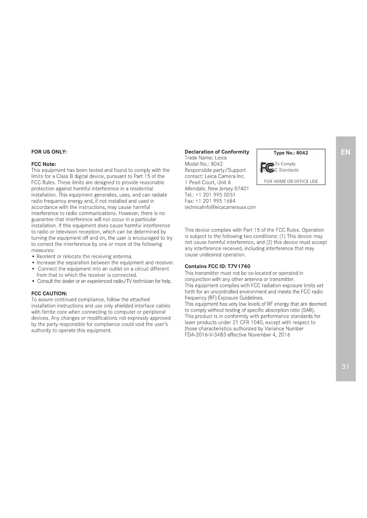 - Consult the dealer or an experienced radio/TV technician for help. FCC CAUTION: To assure continued compliance, follow the attached installation instructions and use only shielded interface cables with ferrite core when connecting to computer or peripheral devices. Any changes or modifications not expressly approved by the party responsible for compliance could void the user’s authority to operate this equipment. Declaration of Conformity Trade Name: Leica Model No.: 8042 Responsible party/Support contact: Leica Camera Inc. 1 Pearl Court, Unit A Allendale, New Jersey 07401 Tel.: +1 201 995 0051 Fax: +1 201 995 1684 technicalinfo@leicacamerausa.com Type No.: 8042 Tested To Comply With FCC Standards