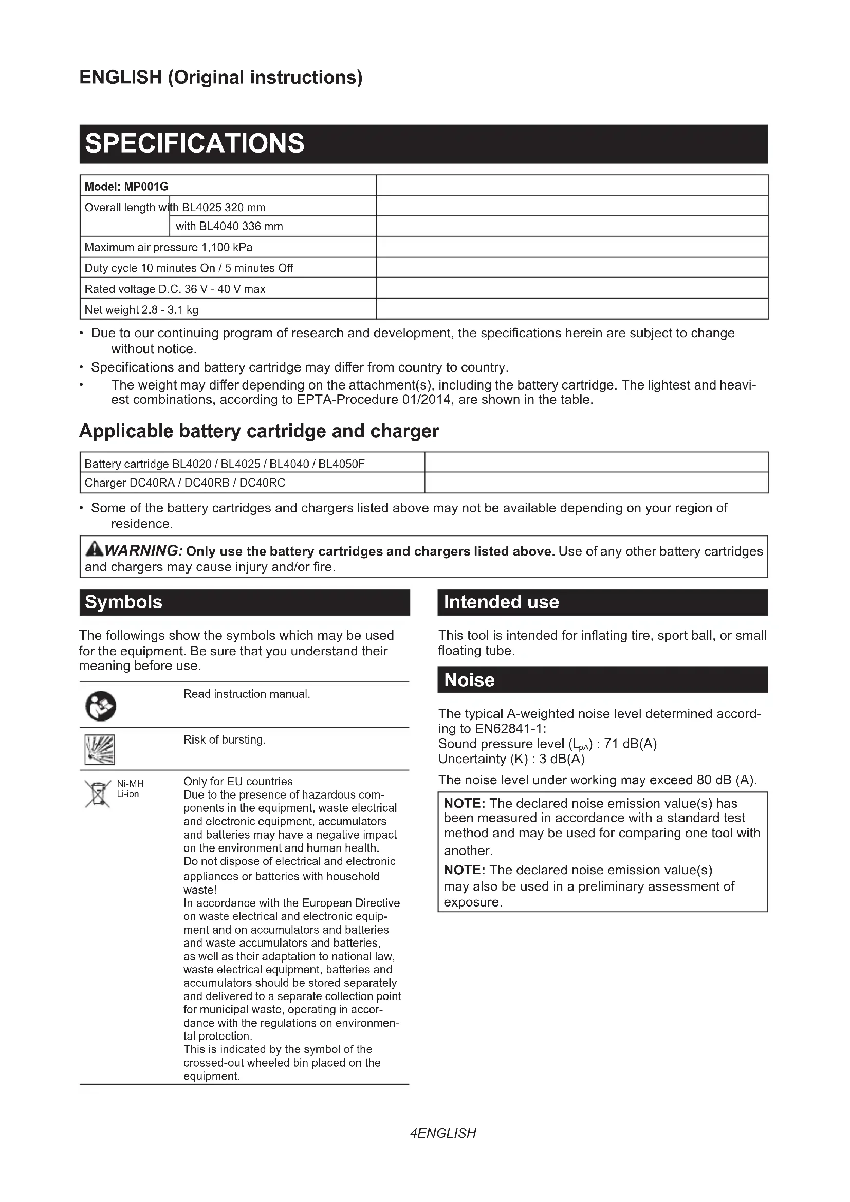 and chargers may cause injury and/or re. Symbols The followings show the symbols which may be used for the equipment. Be sure that you understand their meaning before use. Read instruction manual. Risk of bursting. Ni-MH Li-ion Only for EU countries Due to the presence of hazardous com- ponents in the equipment, waste electrical and electronic equipment, accumulators and batteries may have a negative impact on the environment and human health. Do not dispose of electrical and electronic appliances or batteries with household waste! In accordance with the European Directive on waste electrical and electronic equip- ment and on accumulators and batteries and waste accumulators and batteries, as well as their adaptation to national law, waste electrical equipment, batteries and accumulators should be stored separately and delivered to a separate collection point for municipal waste, operating in accor- dance with the regulations on environmen- tal protection. This is indicated by the symbol of the crossed-out wheeled bin placed on the equipment. Intended use This tool is intended for inating tire, sport ball, or small oating tube. Noise The typical A-weighted noise level determined accord- ing to EN62841-1: Sound pressure level (L