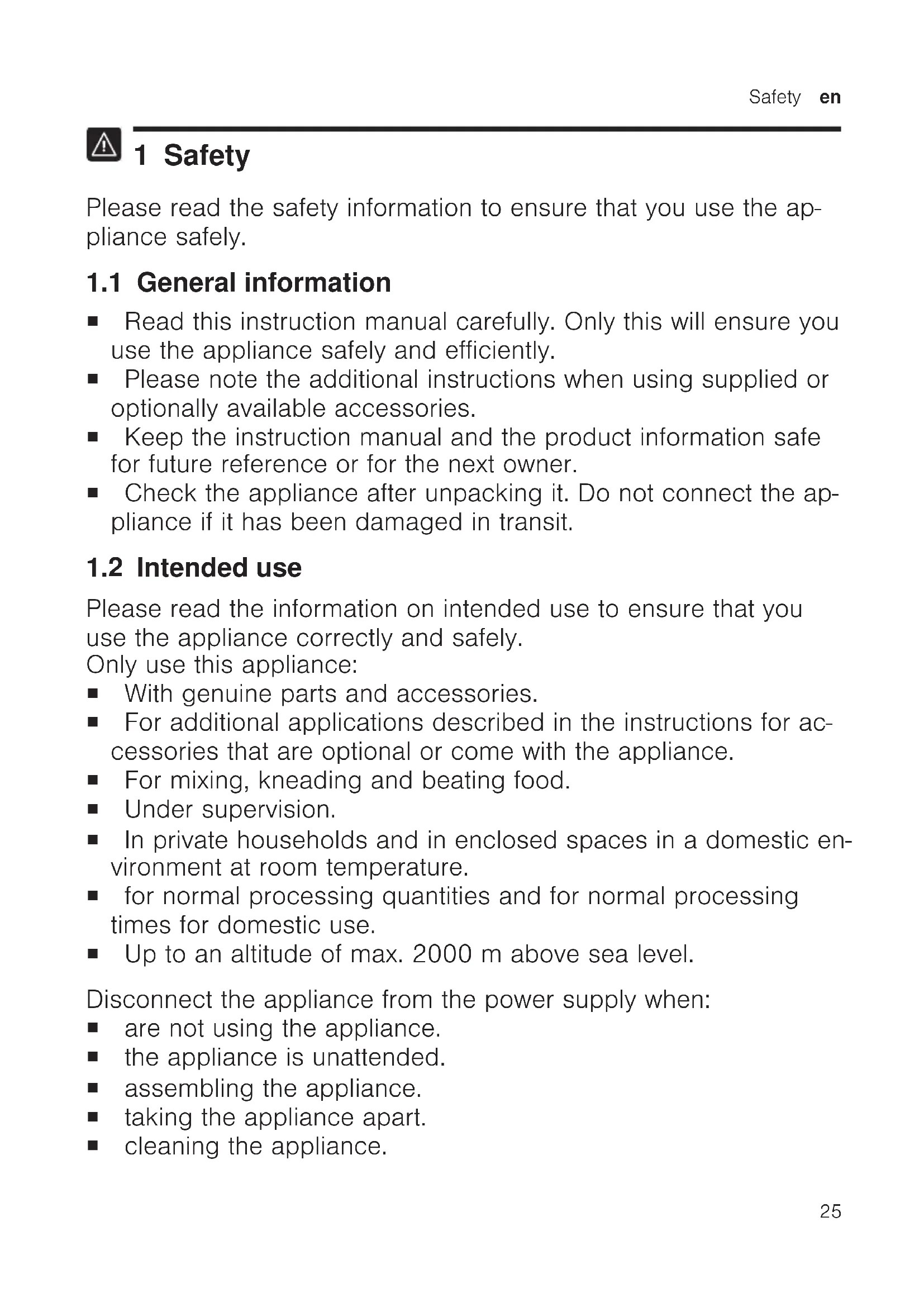 1 Safety Please read the safety information to ensure that you use the ap- pliance safely. 1.1 General information ¡ Read this instruction manual carefully. Only this will ensure you use the appliance safely and efficiently. ¡ Please note the additional instructions when using supplied or optionally available accessories. ¡ Keep the instruction manual and the product information safe for future reference or for the next owner. ¡ Check the appliance after unpacking it. Do not connect the ap- pliance if it has been damaged in transit. 1.2 Intended use Please read the information on intended use to ensure that you use the appliance correctly and safely. Only use this appliance: ¡ With genuine parts and accessories. ¡ For additional applications described in the instructions for ac- cessories that are optional or come with the appliance. ¡ For mixing, kneading and beating food. ¡ Under supervision. ¡ In private households and in enclosed spaces in a domestic en- vironment at room temperature. ¡ for normal processing quantities and for normal processing times for domestic use. ¡ Up to an altitude of max. 2000m above sea level. Disconnect the appliance from the power supply when: ¡ are not using the appliance. ¡ the appliance is unattended. ¡ assembling the appliance. ¡ taking the appliance apart. ¡ cleaning the appliance.en Safety