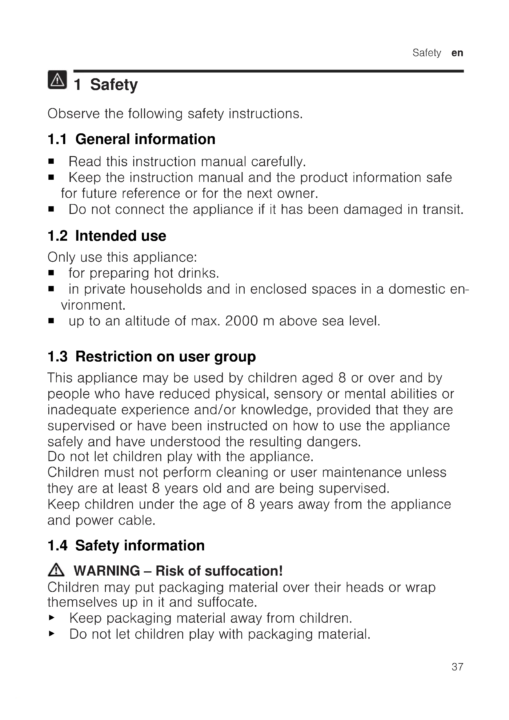 1 Safety Observe the following safety instructions. 1.1 General information ¡ Read this instruction manual carefully. ¡ Keep the instruction manual and the product information safe for future reference or for the next owner. ¡ Do not connect the appliance if it has been damaged in transit. 1.2 Intended use Only use this appliance: ¡ for preparing hot drinks. ¡ in private households and in enclosed spaces in a domestic en- vironment. ¡ up to an altitude of max. 2000m above sea level. 1.3 Restriction on user group This appliance may be used by children aged 8 or over and by people who have reduced physical, sensory or mental abilities or inadequate experience and/or knowledge, provided that they are supervised or have been instructed on how to use the appliance safely and have understood the resulting dangers. Do not let children play with the appliance. Children must not perform cleaning or user maintenance unless they are at least 8 years old and are being supervised. Keep children under the age of 8 years away from the appliance and power cable. 1.4 Safety information WARNING‒Risk of suffocation! Children may put packaging material over their heads or wrap themselves up in it and suffocate. ▶ Keep packaging material away from children. ▶ Do not let children play with packaging material.en Safety