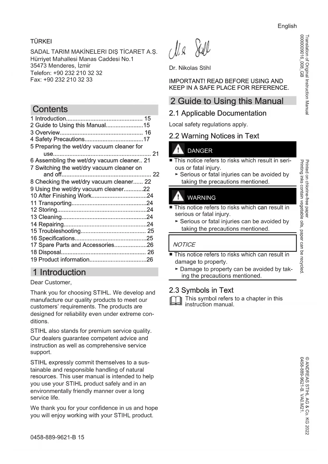 This symbol refers to a chapter in this instruction manual. English 0458-889-9621-B 15 © ANDREAS STIHL AG & Co. KG 2022 0458-889-9621-B. VA0.M21. Printed on chlorine-free paper Printing inks contain vegetable oils, paper can be recycled. Translation of Original Instruction Manual 0000009016_008_GB3 Overview