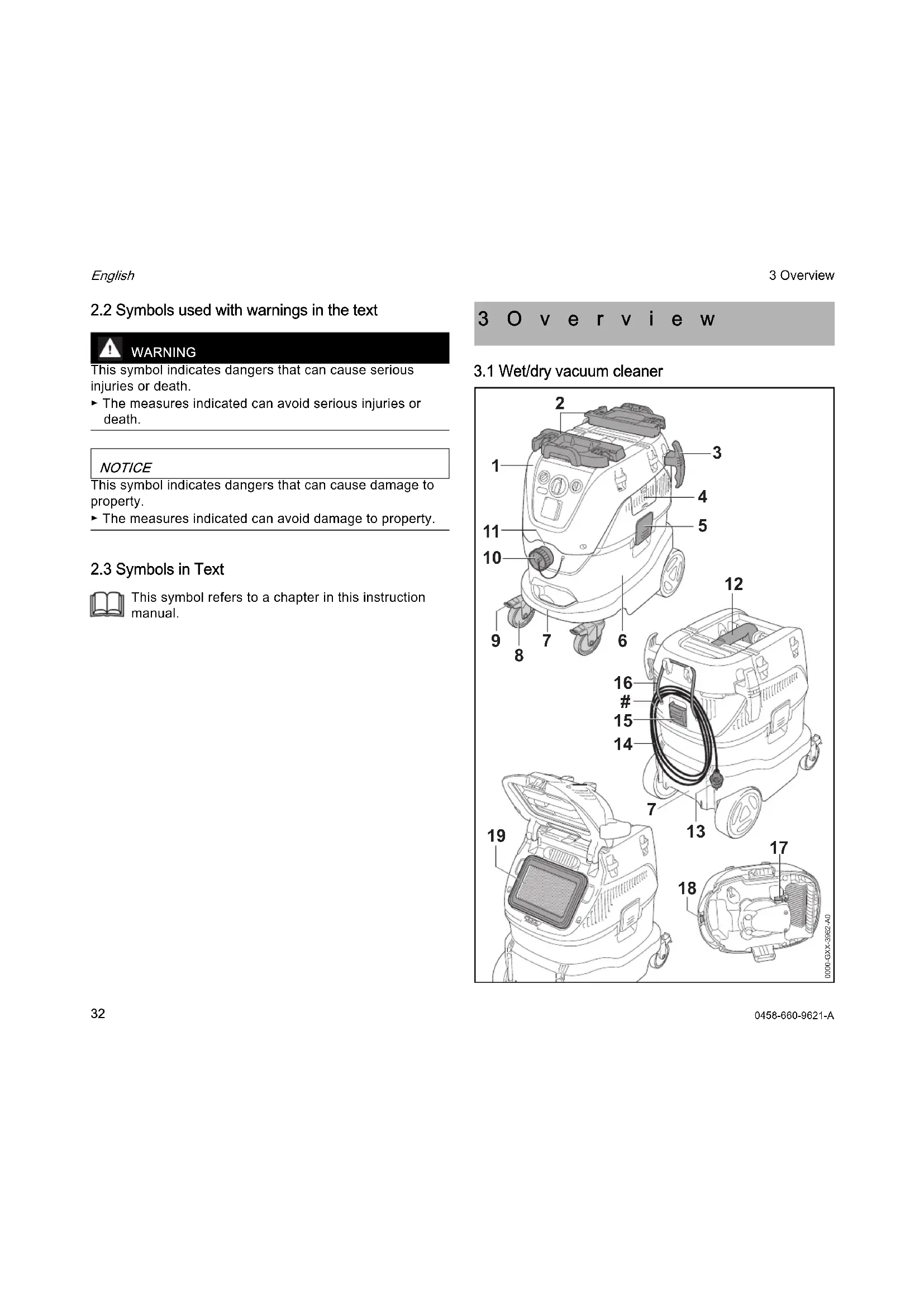 in accordance with IEC 60335-2-69 – Picking up liquids The wet/dry vacuum cleaner is suitable for commercial use, for instance on construction sites, at workshops, factories, hotels, schools, hospitals, in industry, shops, offices and hire firms. The wet/dry vacuum cleaner switches on and off together with a connected electric power tool. When the electric power tool is switched off, the wet/dry vacuum cleaner remains switched on for a further 5 seconds to completely empty the suction hose. In this position of the rotary switch the wet/dry vacuum cleaner is switched off and the socket is still live. In this position of the rotary switch the wet/dry vacuum cleaner is switched on. In this position of the rotary switch the wet/dry vacuum cleaner is operated together with an electric power tool. In this position of the rotary switch automatic filter cleaning is switched off. This symbol denotes monitoring of the air velocity in the suction hose. This symbol denotes setting the suction hose diameter. This symbol denotes setting the suction power. This symbol denotes automatic filter cleaning. 4 Safety Precautions Observe the safety advice and associated measures. Read the Instruction Manual, make sure you have understood it and keep it in a safe place for reference. Observe the safety advice and associated measures for Class M dust.0458-660-9621-A