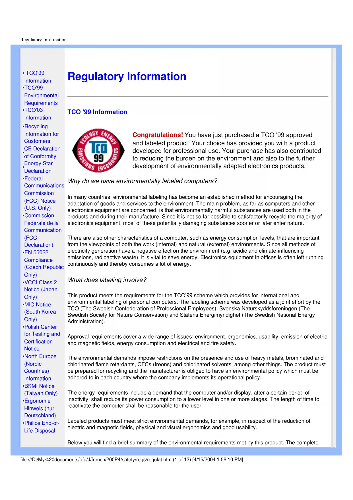 - Philips End-of- Life Disposal Regulatory Information TCO '99 Information Congratulations! You have just purchased a TCO '99 approved and labeled product! Your choice has provided you with a product developed for professional use. Your purchase has also contributed to reducing the burden on the environment and also to the further development of environmentally adapted electronics products. Why do we have environmentally labeled computers? In many countries, environmental labeling has become an established method for encouraging the adaptation of goods and services to the environment. The main problem, as far as computers and other electronics equipment are concerned, is that environmentally harmful substances are used both in the products and during their manufacture. Since it is not so far possible to satisfactorily recycle the majority of electronics equipment, most of these potentially damaging substances sooner or later enter nature. There are also other characteristics of a computer, such as energy consumption levels, that are important from the viewpoints of both the work (internal) and natural (external) environments. Since all methods of electricity generation have a negative effect on the environment (e.g. acidic and climate-influencing emissions, radioactive waste), it is vital to save energy. Electronics equipment in offices is often left running continuously and thereby consumes a lot of energy. What does labeling involve? This product meets the requirements for the TCO'99 scheme which provides for international and environmental labeling of personal computers. The labeling scheme was developed as a joint effort by the TCO (The Swedish Confederation of Professional Employees), Svenska Naturskyddsforeningen (The Swedish Society for Nature Conservation) and Statens Energimyndighet (The Swedish National Energy Administration). Approval requirements cover a wide range of issues: environment, ergonomics, usability, emission of electric and magnetic fields, energy consumption and electrical and fire safety. The environmental demands impose restrictions on the presence and use of heavy metals, brominated and chlorinated flame retardants, CFCs (freons) and chlorinated solvents, among other things. The product must be prepared for recycling and the manufacturer is obliged to have an environmental policy which must be adhered to in each country where the company implements its operational policy. The energy requirements include a demand that the computer and/or display, after a certain period of inactivity, shall reduce its power consumption to a lower level in one or more stages. The length of time to reactivate the computer shall be reasonable for the user. Labeled products must meet strict environmental demands, for example, in respect of the reduction of electric and magnetic fields, physical and visual ergonomics and good usability. Below you will find a brief summary of the environmental requirements met by this product. The complete file:///D|/My%20documents/dfu/J/french/200P4/safety/regs/regulat.htm (1 of 13) [4/15/2004 1:58:10 PM]Regulatory Information