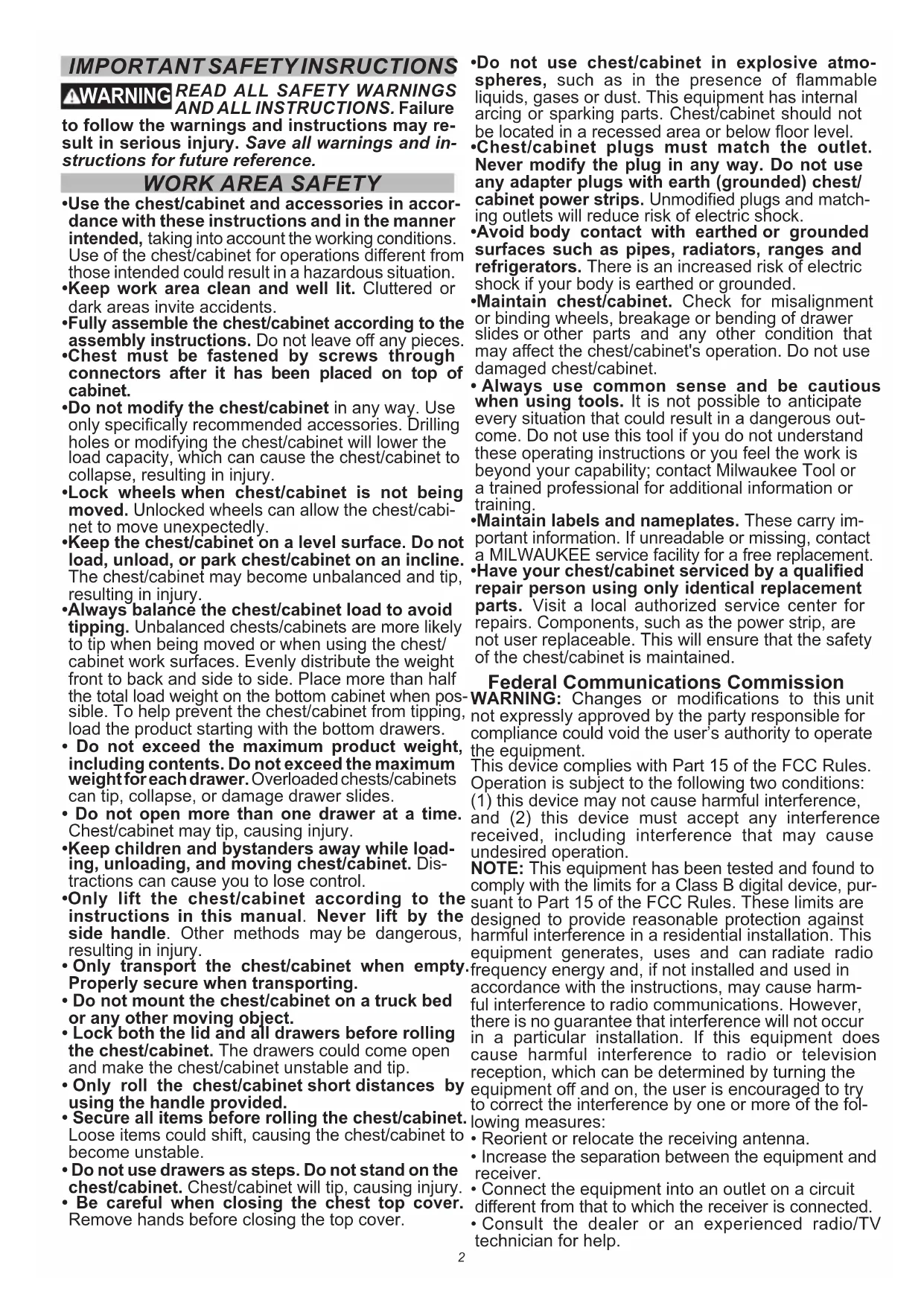 purpose grease or equivalent. Grease Points Cleaning This steel product has been coated with industrial powder coating for a durable nish. To help protect the powder coated nish, do not allow harsh chemi- cals (oil, grease or other chemical) to remain on the powder coating surface. Use a glass cleaner to clean and maintain all surfaces of powder coating. Keep the chest/cabinet handles and wheels clean, dry and free of oil or grease. Use only mild soap and a damp cloth to clean your chest/cabinet since certain cleaning agents and solvents are harm- ful to plastics. Some of these include: gasoline, turpentine, lacquer thinner, chlorinated cleaning solvents, ammonia and household detergents containing ammonia. Never use flammable or combustible solvents around chests/cabinets. Service For service and repair information, including the or- dering of service parts, call our Corporate After Sales Service Technical Support line at 1-800-SAWDUST, or visit our website at www.milwaukeetool.com. ACCESSORIES WARNING Modifying the chest/cabinet to ac- cept other accessories may be hazardous, resulting in injury or property dam- age. Use only specically recommended acces- sories according to the manufacturer's instruc- tions. For a complete listing of accessories, go online to www.milwaukeetool.com or contact a distributor.