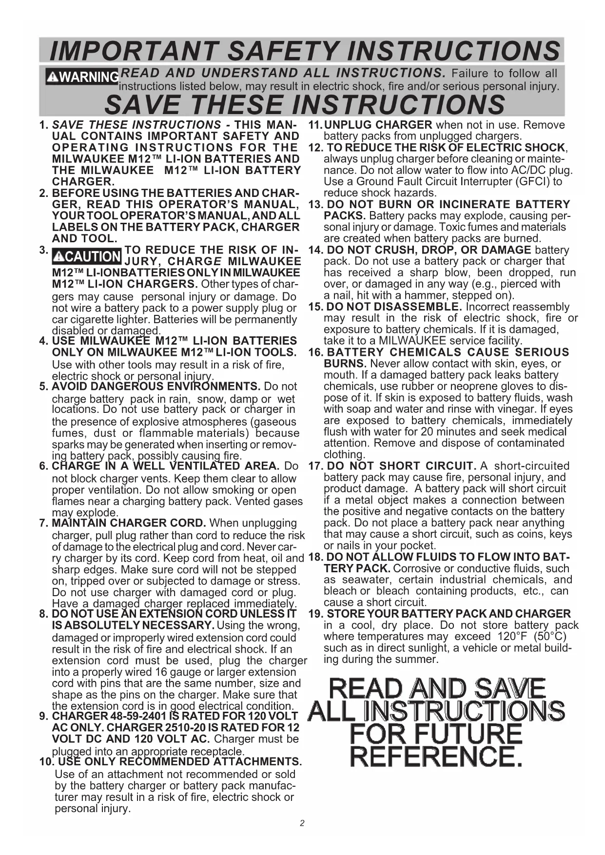 Download the instructions for your Battery charger in PDF format for free! Find your manual 251020 - MILWAUKEE and take your electronic device back in hand. On this page are published all the documents necessary for the use of your device. 251020 by MILWAUKEE.