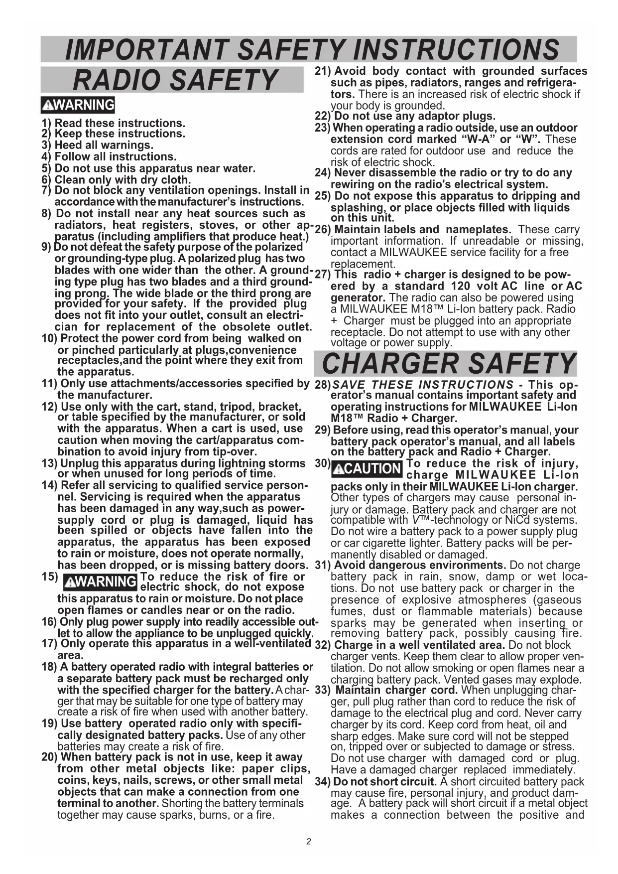 ered by a standard 120 volt AC line or AC generator. The radio can also be powered using a MILWAUKEE M18™ Li-Ion battery pack. Radio + Charger must be plugged into an appropriate receptacle. Do not attempt to use with any other voltage or power supply. CHARGER SAFETY