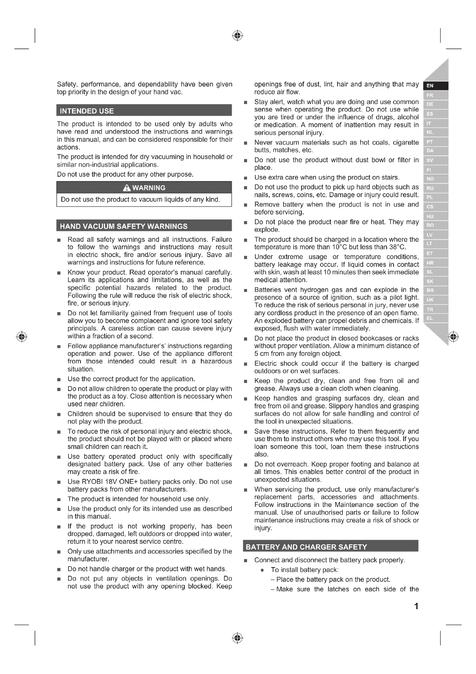 Safety, performance, and dependability have been given top priority in the design of your hand vac. INTENDED USE The product is intended to be used only by adults who have read and understood the instructions and warnings in this manual, and can be considered responsible for their actions. The product is intended for dry vacuuming in household or similar non-industrial applications. Do not use the product for any other purpose. WARNING Do not use the product to vacuum liquids of any kind.