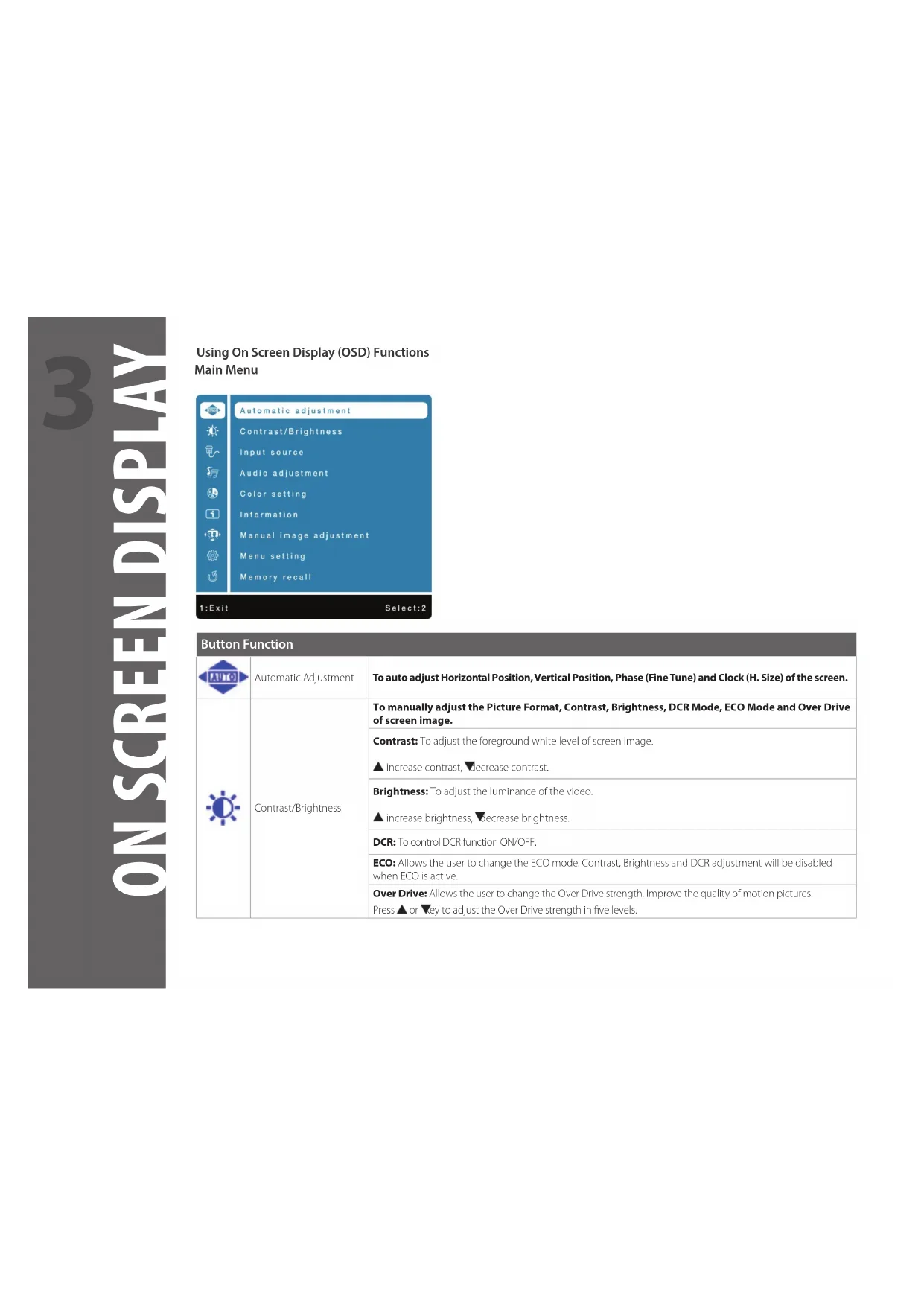 Using On Screen Display (OSD) Functions Main Menu Button Function Automatic Adjustment To auto adjust Horizontal Position, Vertical Position, Phase (Fine Tune) and Clock (H. Size) of the screen. Contrast/Brightness To manually adjust the Picture Format, Contrast, Brightness, DCR Mode, ECO Mode and Over Drive of screen image. Contrast: To adjust the foreground white level of screen image. increase contrast, decrease contrast. Brightness: To adjust the luminance of the video. increase brightness, decrease brightness. DCR: To control DCR function ON/OFF. ECO: Allows the user to change the ECO mode. Contrast, Brightness and DCR adjustment will be disabled when ECO is active. Over Drive: Allows the user to change the Over Drive strength. Improve the quality of motion pictures. Press or key to adjust the Over Drive strength in ve levels.ON SCREEN DISPLAY Button Function