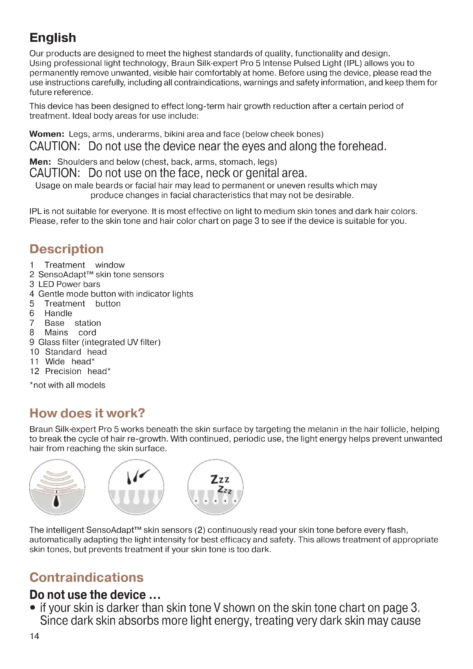 beard / facial hair for men. It is not recommended to use the device on areas of skin where dermal fillers are present. Do not use more than once a week on the same area. Damage of skin my occur after prolonged or repeated treatment on one site. 91590833_Victoria2_PL5_Euro1.indd 1591590833_Victoria2_PL5_Euro1.indd 15 30.10.20 13:4230.10.20 13:4216 Eye safety Do not look directly into the glass filter (9) or attempt to activate the device toward the eyes. To protect the safety of your eyes and those of individuals nearby, the device will only activate when both skin tone sensors are placed against the skin. If at any time the device activates when both sensors are NOT in contact with the skin, STOP use immediately and contact your retailer. Possible eye injury (potentially leading to loss of vision) or skin injury if instructions are not followed. Protect the eye from exposure. Do not use the appliance over the eye lids or close to the eye. Precautions