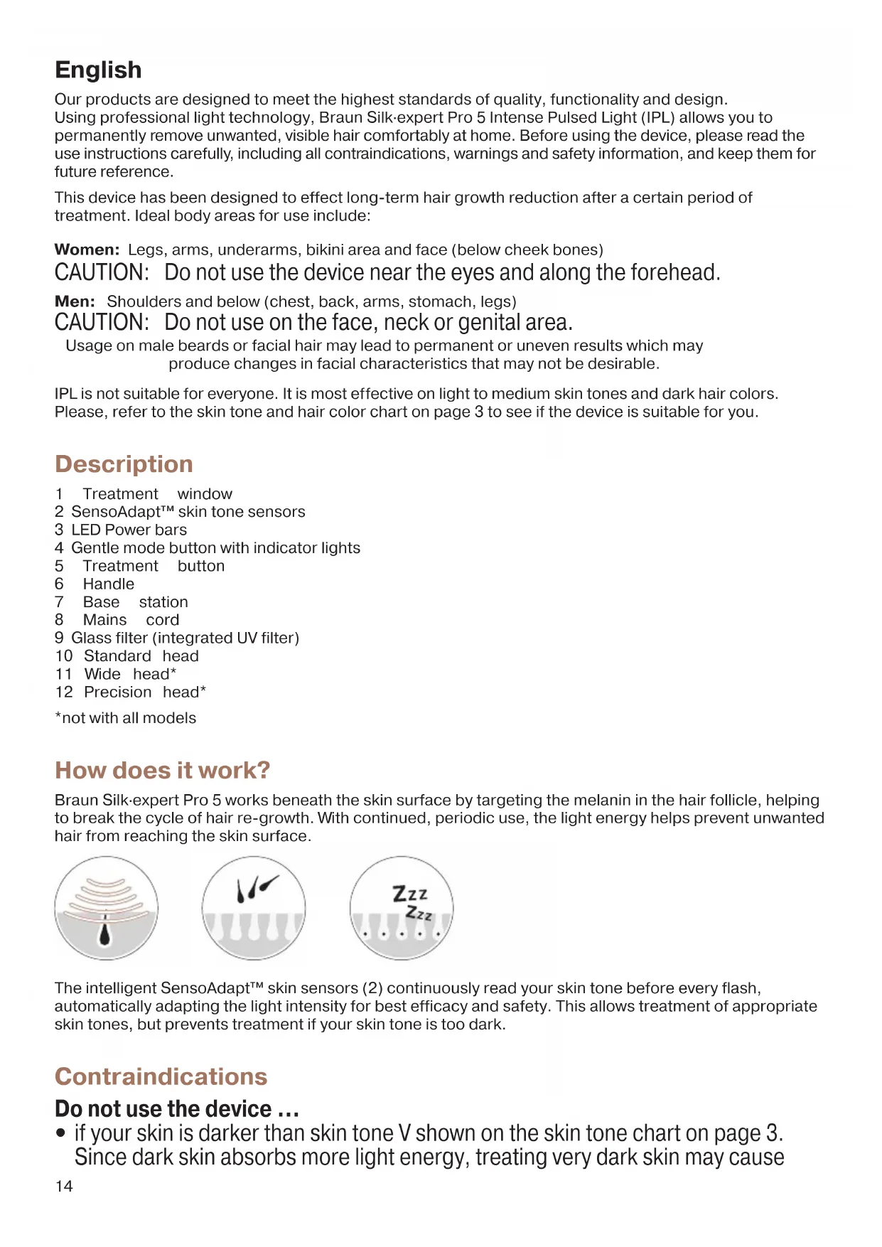 Children should be supervised to ensure that they do not play with the device. Always keep the device out of children’s reach. Electrical and fire safety Regularly check the device and cords for visible signs of damage. In case of damage or cracks, stop using the device. Electric shock may result from using a damaged device. In case of defects, have the device checked and repaired by an authorized service center. Unqualified repair work can lead to extreme hazards for the user. Always unplug the device after use. DANGER Never attempt to repair and open the device, as this may expose you to dangerous electrical components and to pulsed light energy, either of which may cause serious bodily damage and/or permanent eye injury. Do not use in or near water and wet surfaces such as bathtubs, showers, basins or other vessels that may contain water. If the device becomes wet, it should not be used. Electric shock may result from using a wet device. Do not use if the device is damaged (e.g. cracked housing, cord damage etc). Internal parts contain electric charges that are hazardous. Regularly inspect the treatment window (1) for damage: Do not use if the glass filter (9) is cracked or missing. Do not use if the built-in reflector is missing or not in correct place. Do not touch the glass filter during or directly after use since it will get hot. Do not use petroleum-based or flammable cleaning agents (alcohol, acetones) on the device as these pose a fire risk. 91590833_Victoria2_PL5_Euro1.indd 1691590833_Victoria2_PL5_Euro1.indd 16 30.10.20 13:4230.10.20 13:4217 Do not use abrasive cleaning agents. These may damage the device or scratch the glass filter. Do not attempt to use this device other than for removing unwanted hair. Do not use the device on a surface other than skin. Do not press the treatment button when the treatment window (1) is not placed in full contact with the skin. Do not block the cooling vents. The device may overheat and pose an electric shock risk or fire hazard. How to use Preparing the treatment area Remove any visible hair on the skin before using the device. You may use your preferred hair removal method. To keep the treatment window clean and intact, ensure there is no hair remaining on the skin surface. Clean the treatment area and pat it dry. To power on the device: Use the mains cord (8) to connect the base station to an electrical outlet. Press any button (4 or 5) to activate the device. The LED power bars (3) will light up once and a fan starts running. This means the device is in READY mode. During operation, the device will heat up slightly. Automatic light adaptation When both skin tone sensors (2) have skin contact, the device reads your skin tone and selects the appropriate light intensity which is indicated by white LEDs on the Power bars (3). These confirm that the device is ready to flash. light skin tone U high light intensity dark skin tone U low light intensity with fast flash rate no LEDs no skin contact U device will not flash red LED invalid skin tone U device will not flash Gentle mode Push the gentle mode button (4) to reduce the light intensity. You can toggle through the following 3 settings: Standard: 3 indicator lights Gentle: 2 indicator lights Extra gentle: 1 indicator light (lowest light intensity with fast flash rate) Gentle and extra gentle settings are intended for sensitive areas and first time users. With reduced light intensity, more treatments may be required to see the desired effects. The power bars flash to confirm a change in the light intensity setting. When holding the gentle mode button (4) longer than 3 seconds, the device is deactivated. After 10 minutes without use, the device is automatically deactivated. Press any button to re-activate it. Patch Test Before your first treatment, we recommend you test your skin for reaction to Braun Silk·expert on a small area of skin of the body part you plan to treat (about 2 x 3 cm in size; equivalent to the size of two flashes, side by side). Perform a patch test as described below in chapter «Treatment methods», section «STAMPING». Wait 48 hours to examine the test area. If the skin appears normal, begin your first treatment. If a skin reaction develops, discontinue using the device and consult your physician. 91590833_Victoria2_PL5_Euro1.indd 1791590833_Victoria2_PL5_Euro1.indd 17 30.10.20 13:4230.10.20 13:4218 Treatment methods The area to be treated must be hair-free, clean and dry. Before pushing the treatment button, look away from the device to avoid the bright light. In seldom cases, a user may find the flash too bright. However, there is no safety risk associated with this. For increased comfort, we recommend treating in a well-lit room to help reduce the perceived brightness. GLIDING for fast and efficient treatment of large areas (e.g. legs). STAMPING for treating small, hard-to reach areas (e.g. face for females, bikini line, underarms, knee, chin, ankles)
