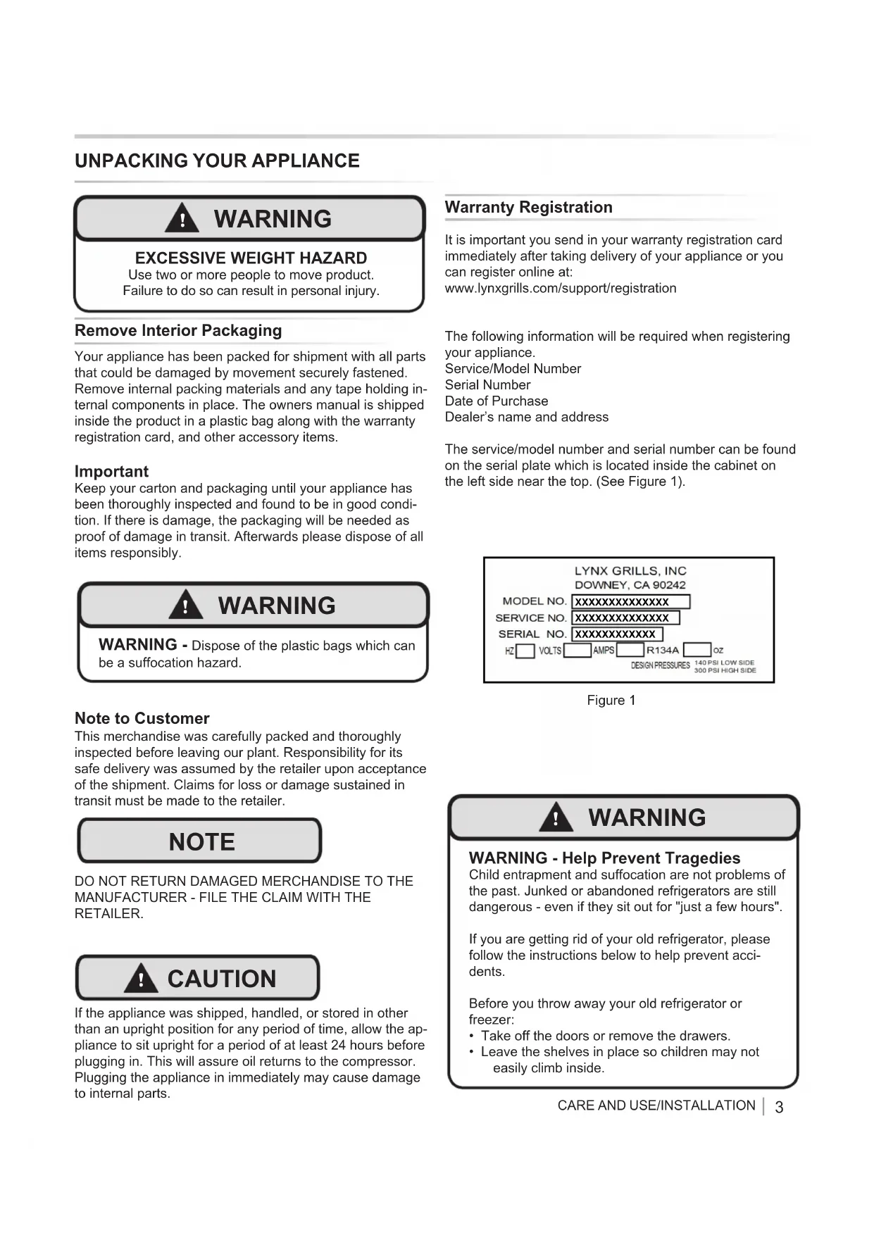 WARNING WARNING - Dispose of the plastic bags which can be a suffocation hazard. Warranty Registration XXXXXXXXXXXXXXXXXXXXXXXXXXXXXXXXXXXXXXXX It is important you send in your warranty registration card immediately after taking delivery of your appliance or you can register online at: www.lynxgrills.com/support/registration The following information will be required when registering your appliance. Service/Model Number Serial Number Date of Purchase Dealer’s name and address The service/model number and serial number can be found on the serial plate which is located inside the cabinet on the left side near the top. (See Figure 1). Remove Interior Packaging4