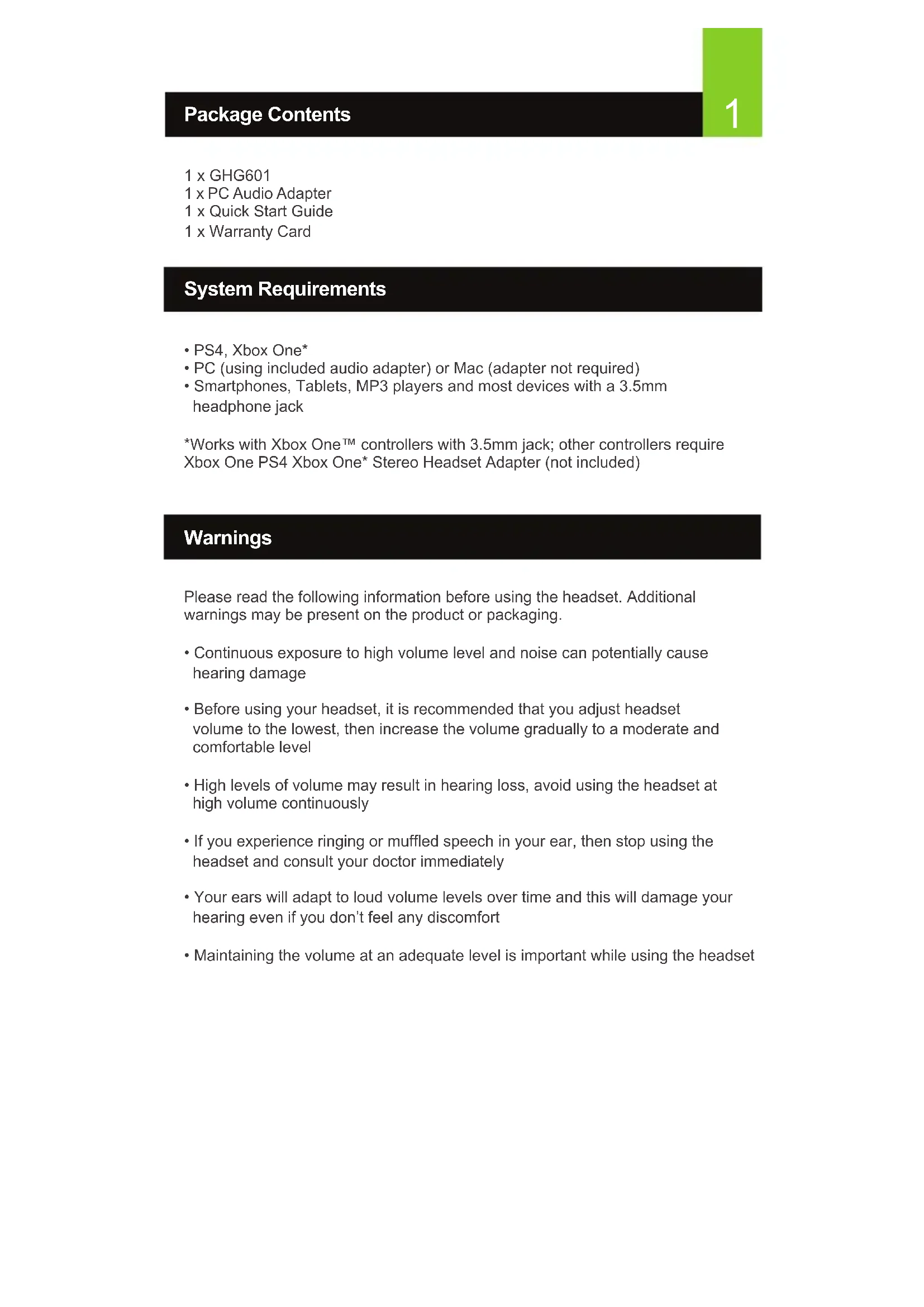 - Smartphones, Tablets, MP3 players and most devices with a 3.5mm headphone jack *Works with Xbox One™ controllers with 3.5mm jack; other controllers require Xbox One PS4 Xbox One* Stereo Headset Adapter (not included) System Requirements Warnings Please read the following information before using the headset. Additional warnings may be present on the product or packaging.