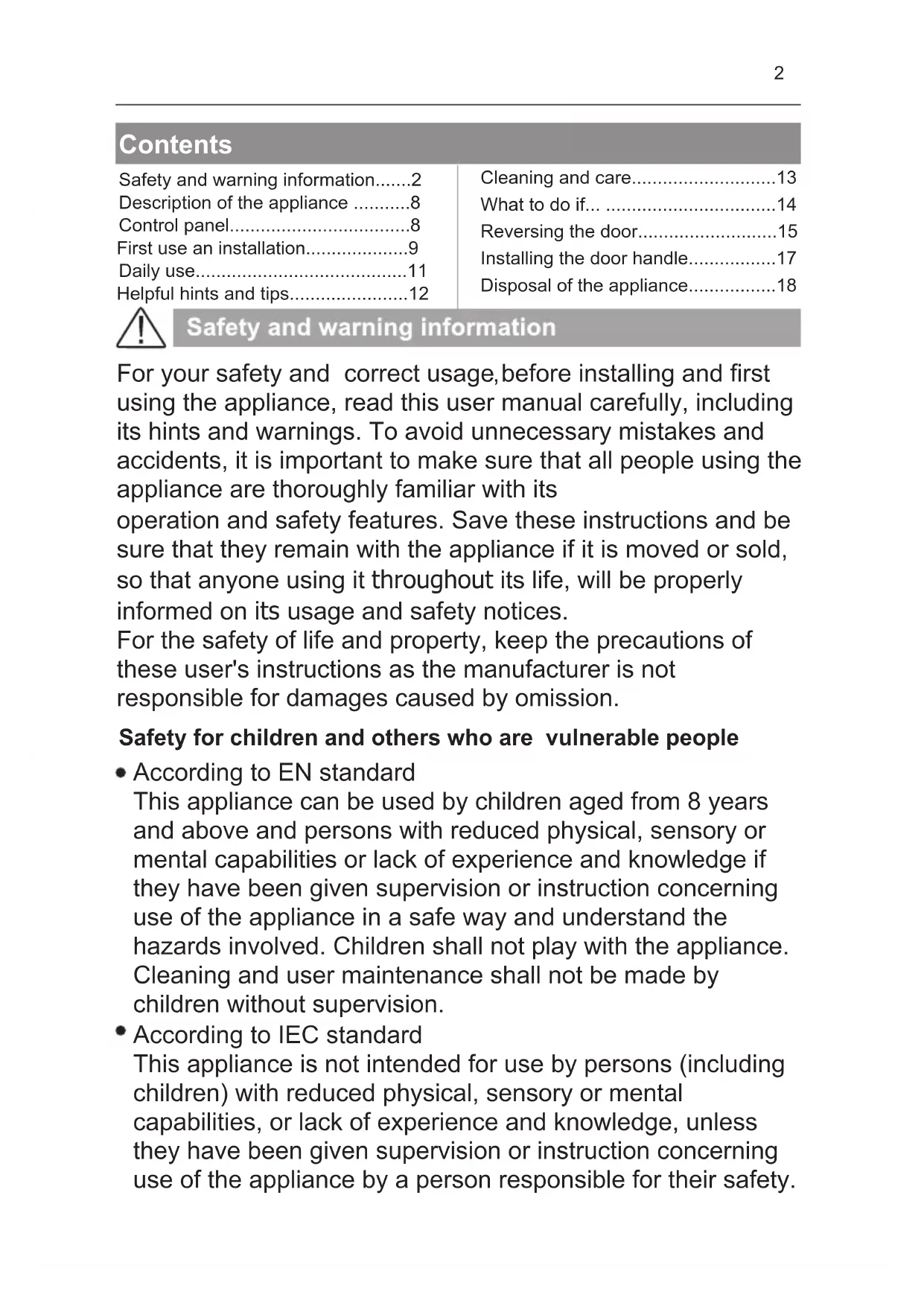 - responsible for damages caused by omission. Safety for children and others who are vulnerable people According to EN standard According to IEC standard This appliance is not intended for use by persons (including children) with reduced physical, sensory or mental capabilities, or lack of experience and knowledge, unless they have been given supervision or instruction concerning use of the appliance by a person responsible for their safety. This appliance can be used by children aged from 8 years and above and persons with reduced physical, sensory or mental capabilities or lack of experience and knowledge if they have been given supervision or instruction concerning use of the appliance in a safe way and understand the hazards involved. Children shall not play with the appliance. Cleaning and user maintenance shall not be made by children without supervision. Safety and warning information p. 2