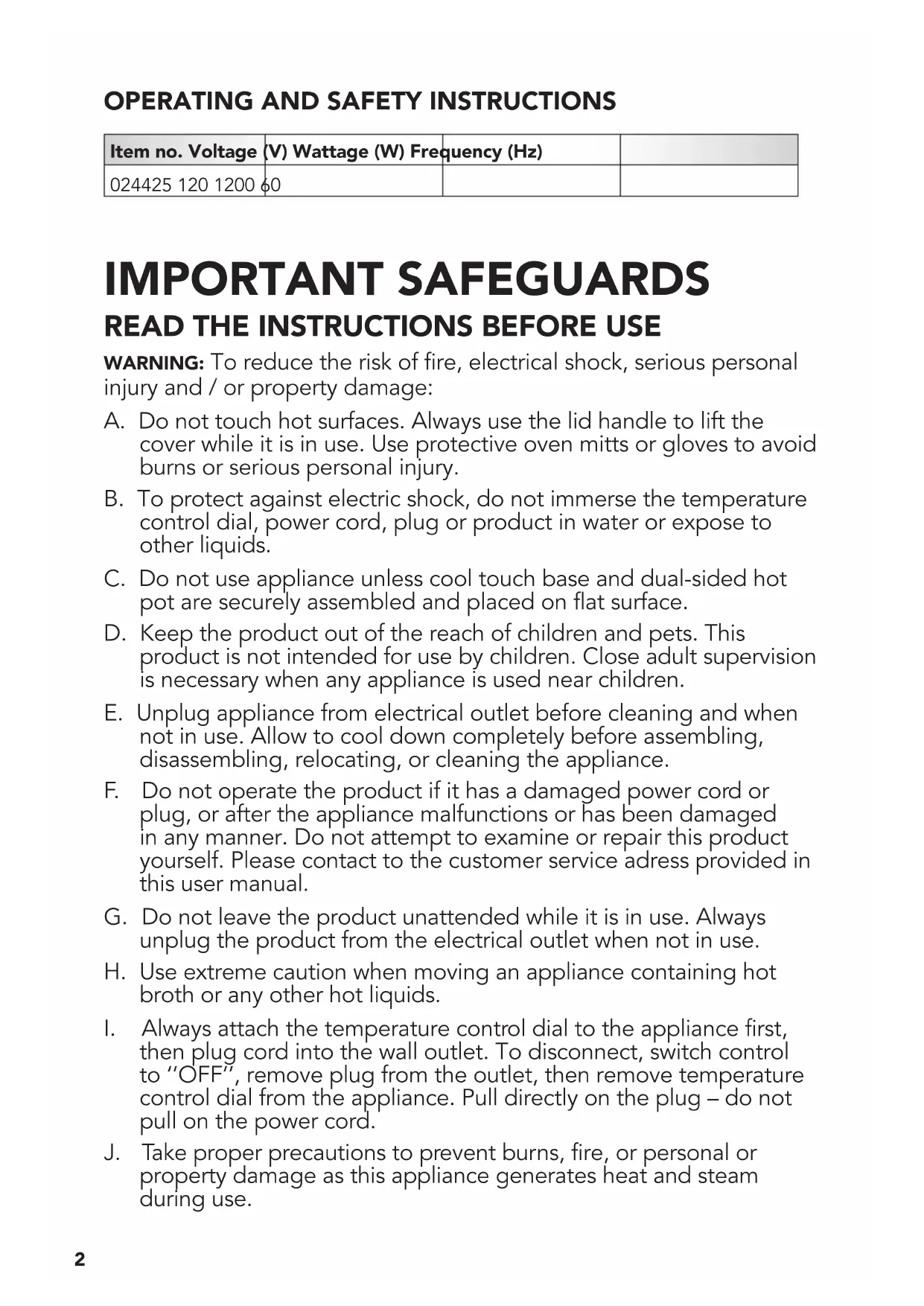 injury and / or property damage: A. Do not touch hot surfaces. Always use the lid handle to lift the cover while it is in use. Use protective oven mitts or gloves to avoid burns or serious personal injury. B. To protect against electric shock, do not immerse the temperature control dial, power cord, plug or product in water or expose to other liquids. C. Do not use appliance unless cool touch base and dual-sided hot pot are securely assembled and placed on flat surface. D. Keep the product out of the reach of children and pets. This product is not intended for use by children. Close adult supervision is necessary when any appliance is used near children. E. Unplug appliance from electrical outlet before cleaning and when not in use. Allow to cool down completely before assembling, disassembling, relocating, or cleaning the appliance. F. Do not operate the product if it has a damaged power cord or plug, or after the appliance malfunctions or has been damaged in any manner. Do not attempt to examine or repair this product yourself. Please contact to the customer service adress provided in this user manual. G. Do not leave the product unattended while it is in use. Always unplug the product from the electrical outlet when not in use. H. Use extreme caution when moving an appliance containing hot broth or any other hot liquids.