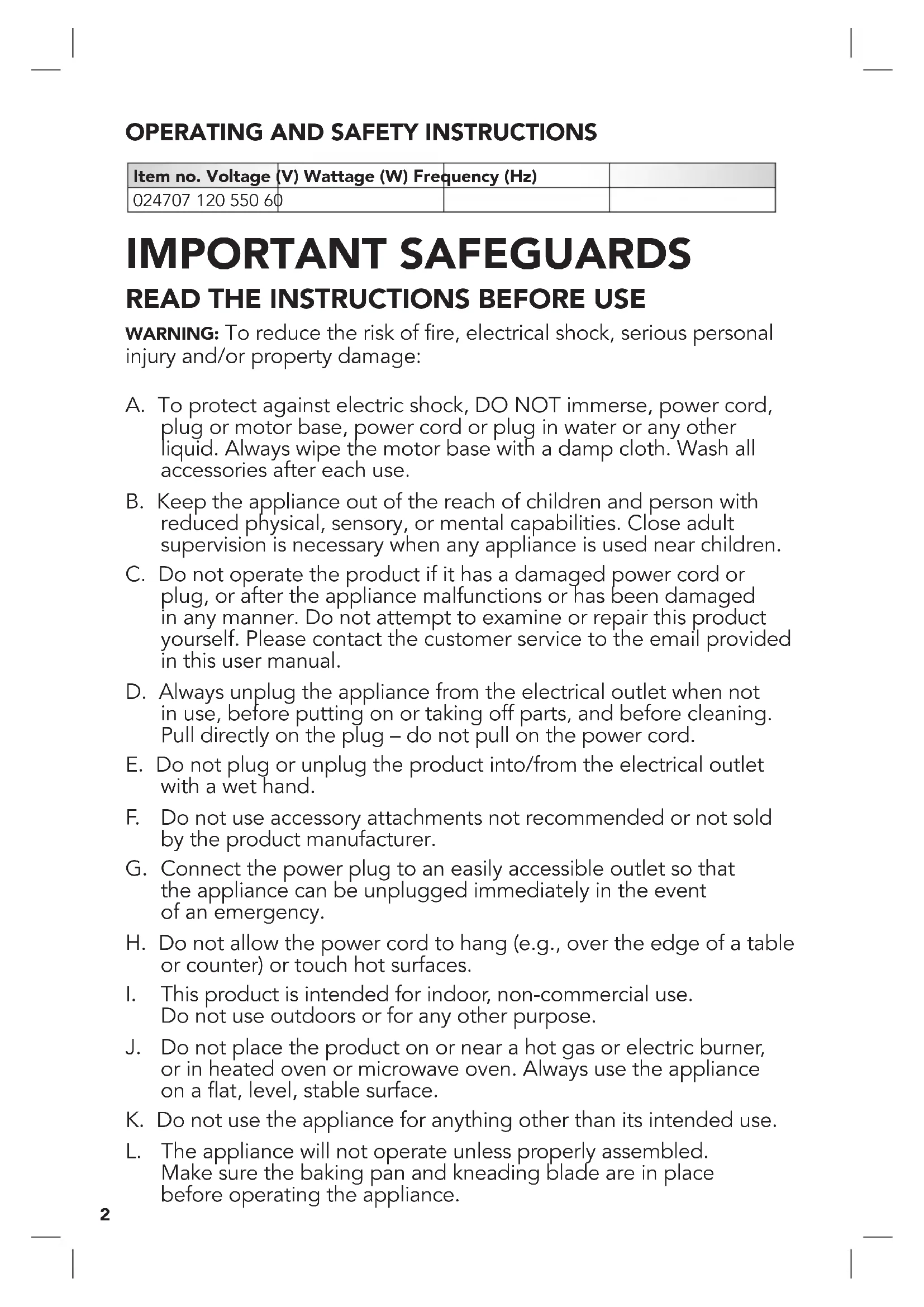 Do not use outdoors or for any other purpose. J. Do not place the product on or near a hot gas or electric burner, or in heated oven or microwave oven. Always use the appliance on a flat, level, stable surface. K. Do not use the appliance for anything other than its intended use. L. The appliance will not operate unless properly assembled. Make sure the baking pan and kneading blade are in place before operating the appliance.3 M. Do not attempt to insert metal foils or baking sheets inside the baking pan as this represent a risk of fire and short circuit. N. Always use the provided parts and accessories to avoid injuries. Avoid contact with moving parts to prevent personal injury or damage to the appliance. O. Ensure appliance has completely stopped operating before disassembling, cleaning or storing. P. Let the appliance cool off for a period of 30 minutes between each cycle. Do not operate the appliance for 2 consecutive cycles as it may cause the appliance to overheat and shut down. Q. Do not leave the bread maker unattended while it is operating. Do not move the bread maker while in operation. DO NOT attempt to move or relocate the appliance while it is in use. R. Do not put your fingers or other objects into the bread maker while it is in operation. Avoid contact with moving parts. S. Do not block or obstruct appliance air vents. While in use, provide adequate space above and around the appliance for air circulation. T. Do not place anything on the appliance while operating. U. Never insert food with hands. Always use the provided measuring cup and spoon.