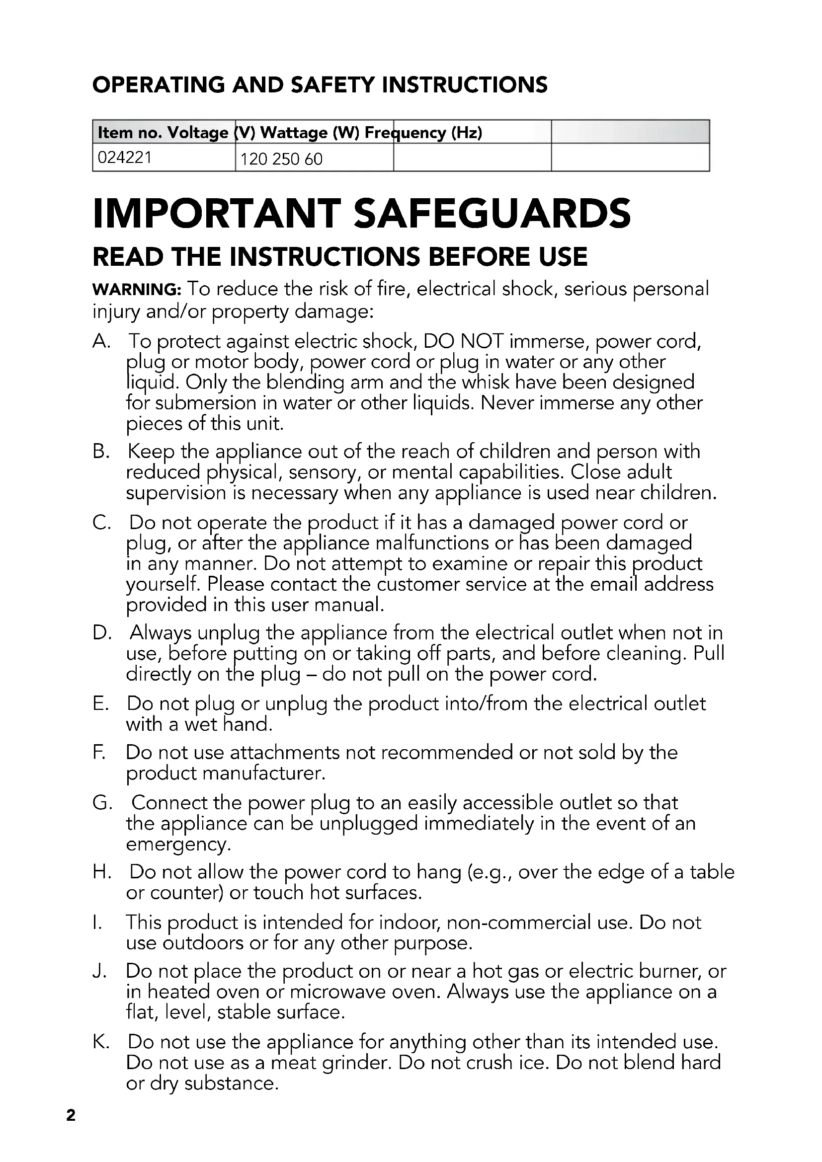 injury and/or property damage: A. To protect against electric shock, DO NOT immerse, power cord, plug or motor body, power cord or plug in water or any other liquid. Only the blending arm and the whisk have been designed for submersion in water or other liquids. Never immerse any other pieces of this unit. B. Keep the appliance out of the reach of children and person with reduced physical, sensory, or mental capabilities. Close adult supervision is necessary when any appliance is used near children. C. Do not operate the product if it has a damaged power cord or plug, or after the appliance malfunctions or has been damaged in any manner. Do not attempt to examine or repair this product yourself. Please contact the customer service at the email address provided in this user manual. D. Always unplug the appliance from the electrical outlet when not in use, before putting on or taking off parts, and before cleaning. Pull directly on the plug – do not pull on the power cord. E. Do not plug or unplug the product into/from the electrical outlet with a wet hand. F. Do not use attachments not recommended or not sold by the product manufacturer. G. Connect the power plug to an easily accessible outlet so that the appliance can be unplugged immediately in the event of an emergency. H. Do not allow the power cord to hang (e.g., over the edge of a table or counter) or touch hot surfaces.