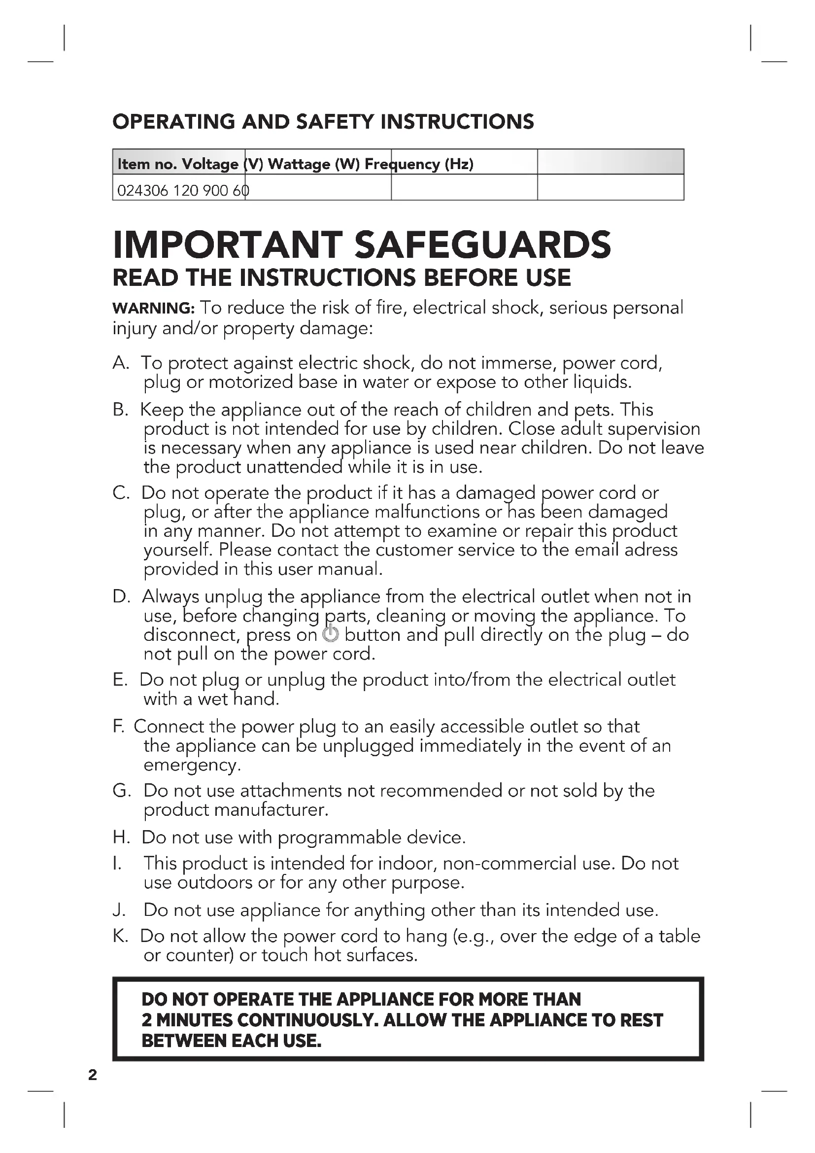 use outdoors or for any other purpose. J. Do not use appliance for anything other than its intended use. K. Do not allow the power cord to hang (e.g., over the edge of a table or counter) or touch hot surfaces. DO NOT OPERATE THE APPLIANCE FOR MORE THAN 2MINUTES CONTINUOUSLY. ALLOW THE APPLIANCE TO REST