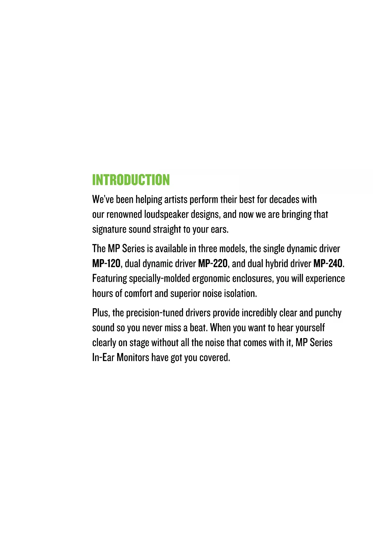 MP-240 MP-220 MP-120 Dual Hybrid Driver Professional In-Ear Monitors Dual Dynamic Driver Professional In-Ear Monitors Single Dynamic Driver Professional In-Ear Monitorswww.mackie.comINTRODUCTION We’ve been helping artists perform their best for decades with our renowned loudspeaker designs, and now we are bringing that signature sound straight to your ears. The MP Series is available in three models, the single dynamic driver MP-120, dual dynamic driver MP-220, and dual hybrid driver MP-240. Featuring specially-molded ergonomic enclosures, you will experience hours of comfort and superior noise isolation. Plus, the precision-tuned drivers provide incredibly clear and punchy sound so you never miss a beat. When you want to hear yourself clearly on stage without all the noise that comes with it, MP Series In-Ear Monitors have got you covered.MP-120 Features