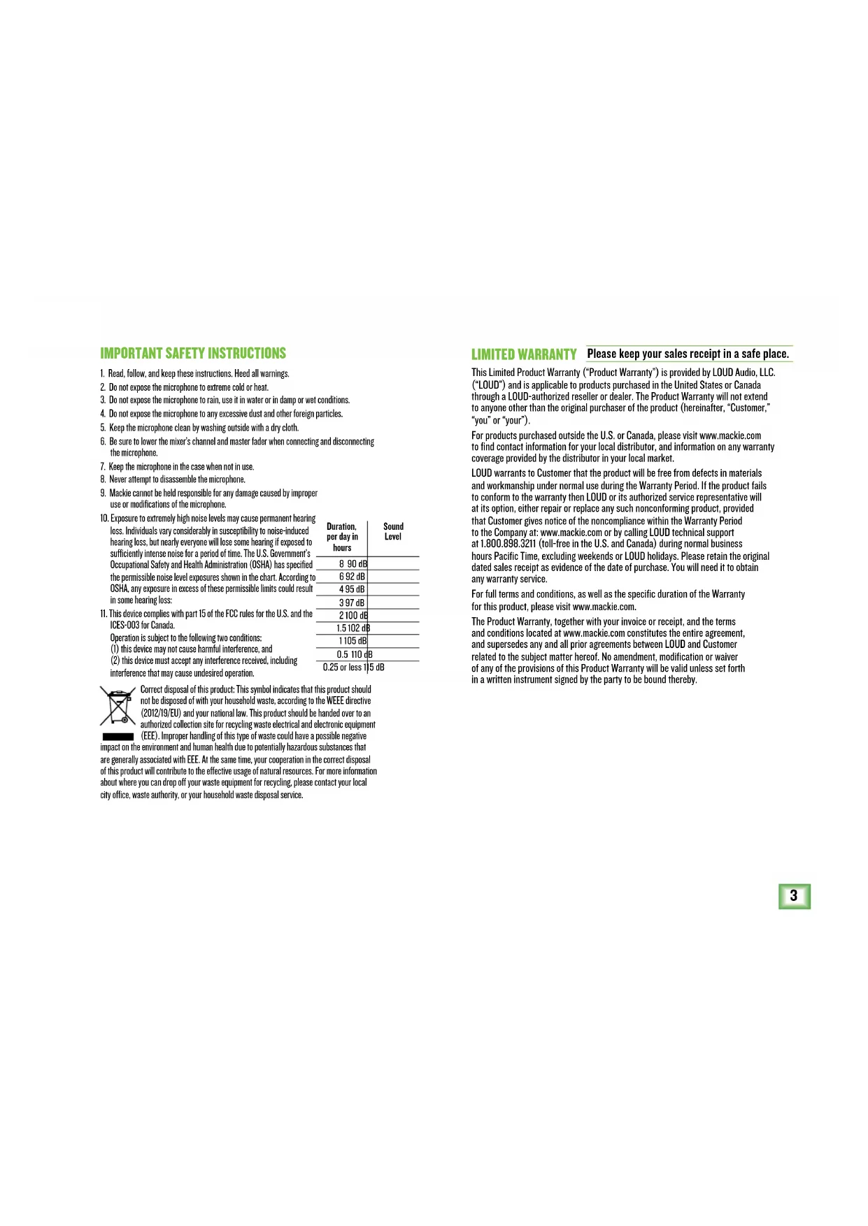 ICES-003 for Canada. Operation is subject to the following two conditions: (1) this device may not cause harmful interference, and (2) this device must accept any interference received, including interference that may cause undesired operation. Correct disposal of this product: This symbol indicates that this product should not be disposed of with your household waste, according to the WEEE directive (2012/19/EU) and your national law. This product should be handed over to an authorized collection site for recycling waste electrical and electronic equipment (EEE). Improper handling of this type of waste could have a possible negative impact on the environment and human health due to potentially hazardous substances that are generally associated with EEE. At the same time, your cooperation in the correct disposal of this product will contribute to the effective usage of natural resources. For more information about where you can drop off your waste equipment for recycling, please contact your local city office, waste authority, or your household waste disposal service. Please keep your sales receipt in a safe place. LIMITED WARRANTY This Limited Product Warranty (“Product Warranty”) is provided by LOUD Audio, LLC. (“LOUD”) and is applicable to products purchased in the United States or Canada through a LOUD-authorized reseller or dealer. The Product Warranty will not extend to anyone other than the original purchaser of the product (hereinafer, “Customer,” “you” or “your”). For products purchased outside the U.S. or Canada, please visit www.mackie.com to find contact information for your local distributor, and information on any warranty coverage provided by the distributor in your local market. LOUD warrants to Customer that the product will be free from defects in materials and workmanship under normal use during the Warranty Period. If the product fails to conform to the warranty then LOUD or its authorized service representative will at its option, either repair or replace any such nonconforming product, provided that Customer gives notice of the noncompliance within the Warranty Period to the Company at: www.mackie.com or by calling LOUD technical support at .800.898.32 (toll-free in the U.S. and Canada) during normal business hours Pacific Time, excluding weekends or LOUD holidays. Please retain the original dated sales receipt as evidence of the date of purchase. You will need it to obtain any warranty service. For full terms and conditions, as well as the specific duration of the Warranty for this product, please visit www.mackie.com. The Product Warranty, together with your invoice or receipt, and the terms and conditions located at www.mackie.com constitutes the entire agreement, and supersedes any and all prior agreements between LOUD and Customer related to the subject matter hereof. No amendment, modification or waiver of any of the provisions of this Product Warranty will be valid unless set forth in a written instrument signed by the party to be bound thereby. Duration, per day in hours Sound Level 8 90 dB 6 92 dB 4 95 dB 3 97 dB 2 00 dB .5 02 dB 05 dB