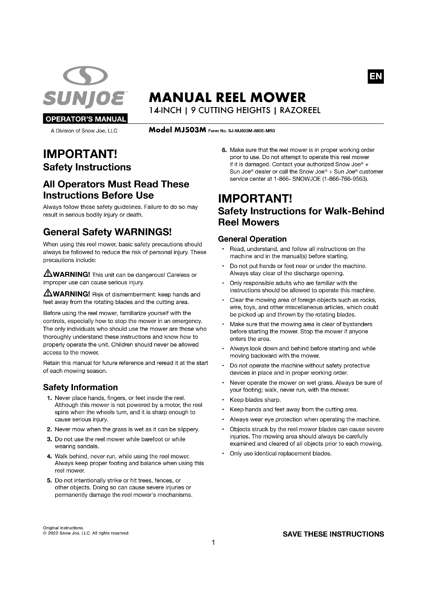 Original instructions.© 2022 Snow Joe, LLC. All rights reserved. IMPORTANT! Safety Instructions All Operators Must Read These Instructions Before Use Always follow these safety guidelines. Failure to do so may result in serious bodily injury or death. General Safety WARNINGS! When using this reel mower, basic safety precautions should always be followed to reduce the risk of personal injury. These precautions include: mWARNING! This unit can be dangerous! Careless or improper use can cause serious injury. mWARNING! Risk of dismemberment: keep hands and feet away from the rotating blades and the cutting area. Before using the reel mower, familiarize yourself with the controls, especially how to stop the mower in an emergency. The only individuals who should use the mower are those who thoroughly understand these instructions and know how to properly operate the unit. Children should never be allowed access to the mower. Retain this manual for future reference and reread it at the start of each mowing season. Safety Information