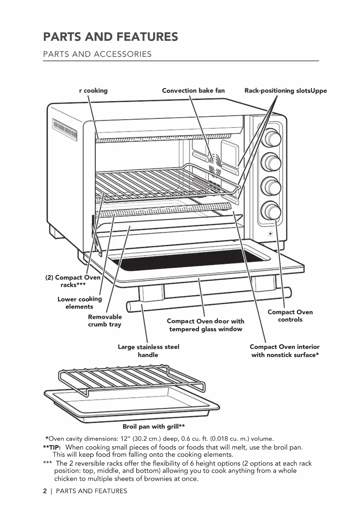 Rack-positioning slotsUpper cooking elements Compact Oven controls Convection bake fan Lower cooking elements (2) Compact Oven racks*** Removable crumb tray Compact Oven door with tempered glass window Broil pan with grill** Large stainless steel handle Compact Oven interior with nonstick surface*