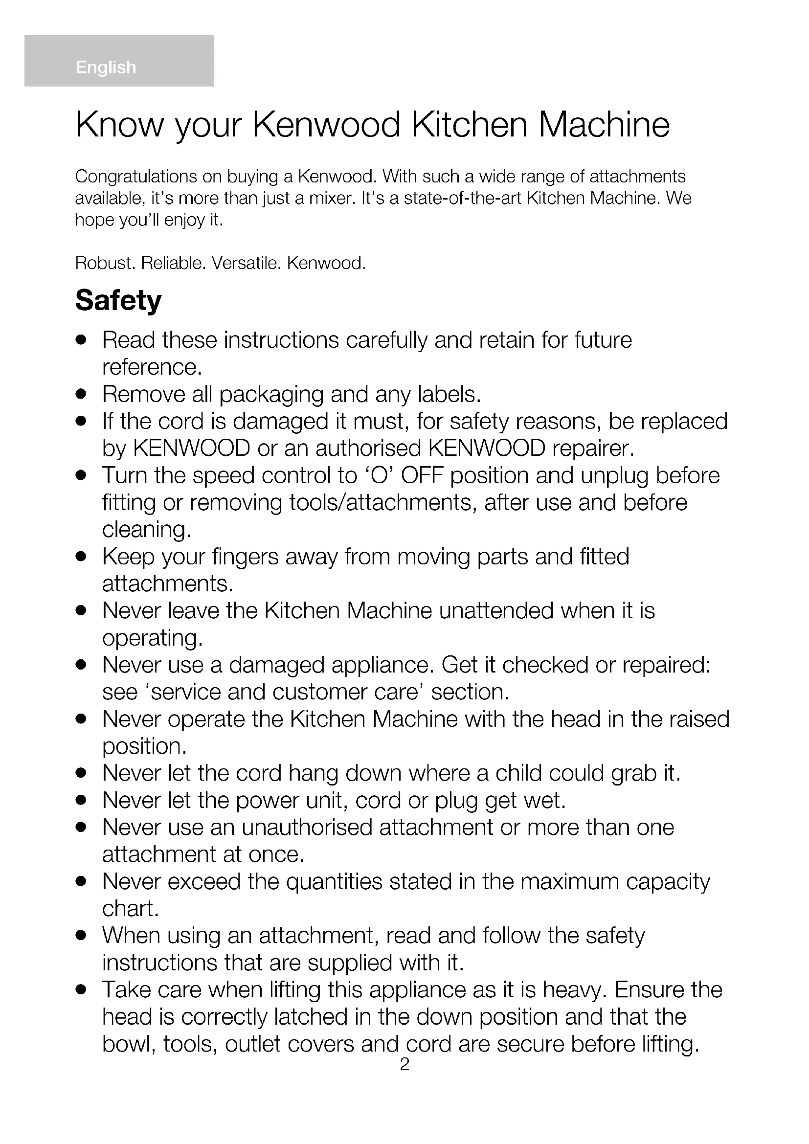 Know your Kenwood Kitchen Machine Congratulations on buying a Kenwood. With such a wide range of attachments available, it’s more than just a mixer. It’s a state-of-the-art Kitchen Machine. We hope you’ll enjoy it. Robust. Reliable. Versatile. Kenwood.