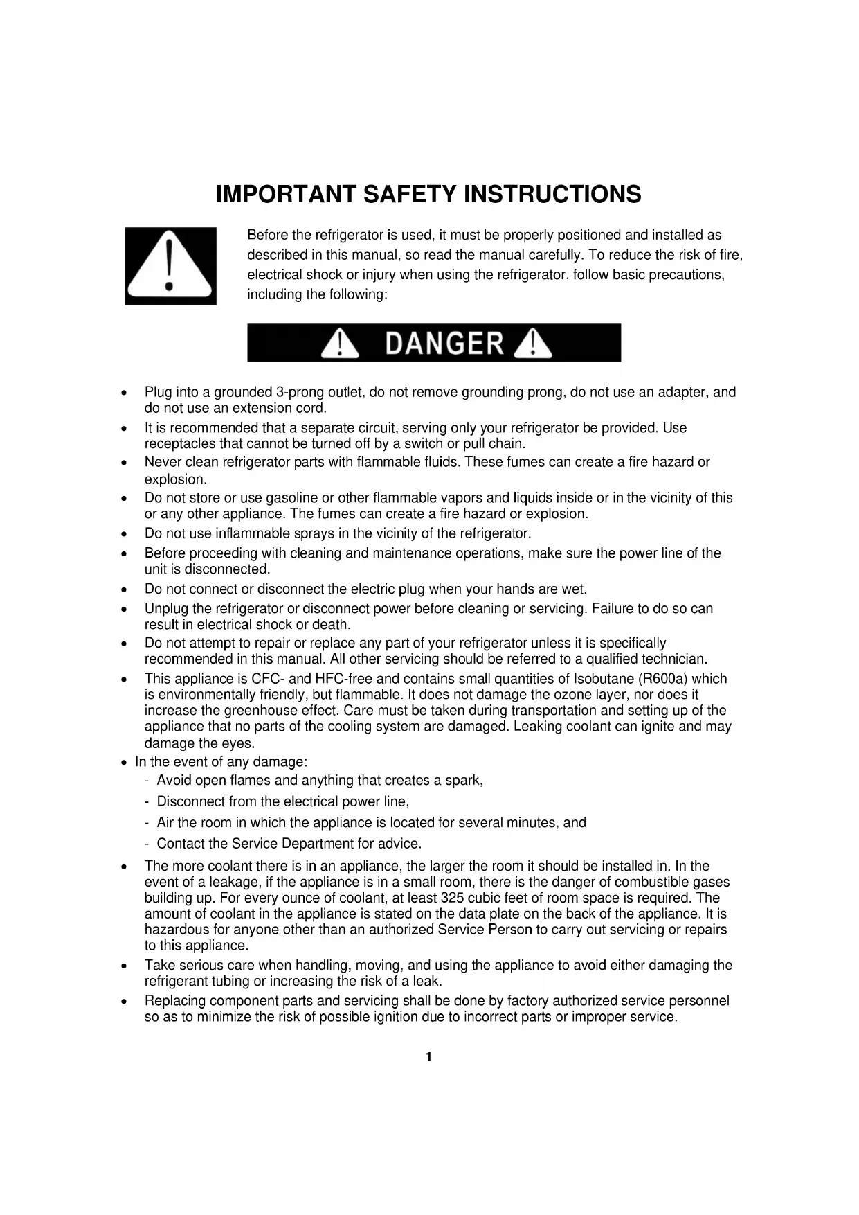 The more coolant there is in an appliance, the larger the room it should be installed in. In the event of a leakage, if the appliance is in a small room, there is the danger of combustible gases building up. For every ounce of coolant, at least 325 cubic feet of room space is required. The amount of coolant in the appliance is stated on the data plate on the back of the appliance. It is hazardous for anyone other than an authorized Service Person to carry out servicing or repairs to this appliance.
