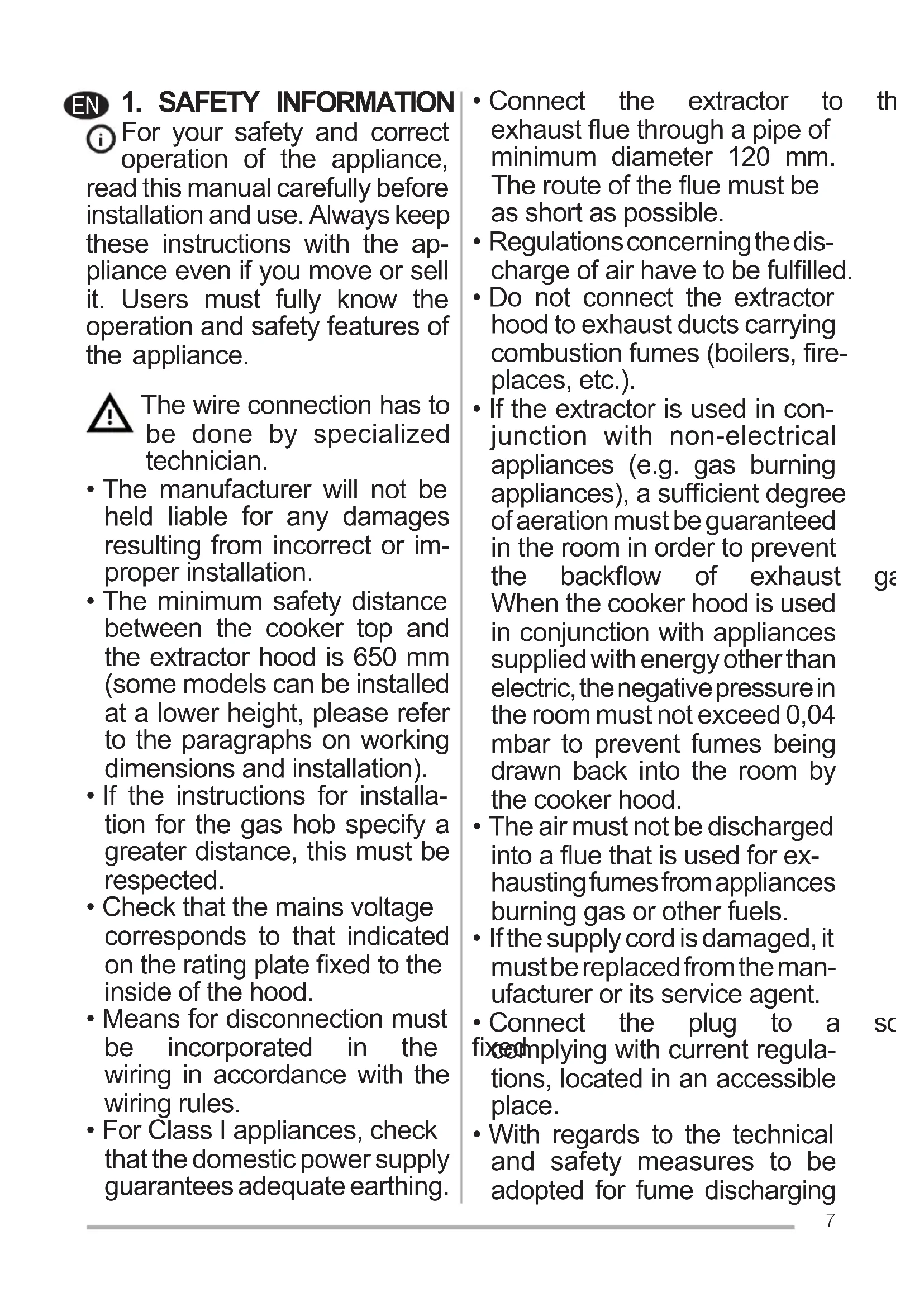 - If the extractor is used in con- junction with non-electrical appliances (e.g. gas burning appliances),asufcientdegree of aeration must be guaranteed in the room in order to prevent the backow of exhaust gas. When the cooker hood is used in conjunction with appliances supplied with energy other than electric, the negative pressure in the room must not exceed 0,04 mbar to prevent fumes being drawn back into the room by the cooker hood.