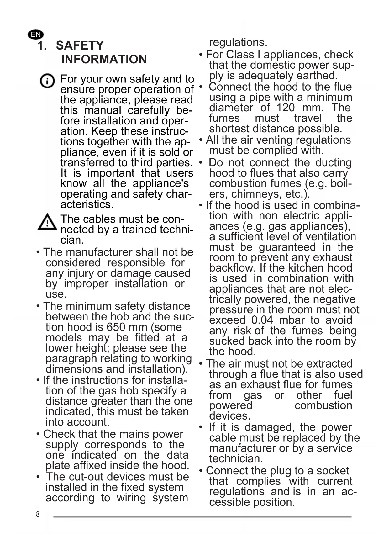 INFORMATION For your own safety and to ensure proper operation of the appliance, please read this manual carefully be- fore installation and oper- ation. Keep these instruc- tions together with the ap- pliance, even if it is sold or transferred to third parties. It is important that users know all the appliance's operating and safety char- acteristics. The cables must be con- nected by a trained techni- cian.