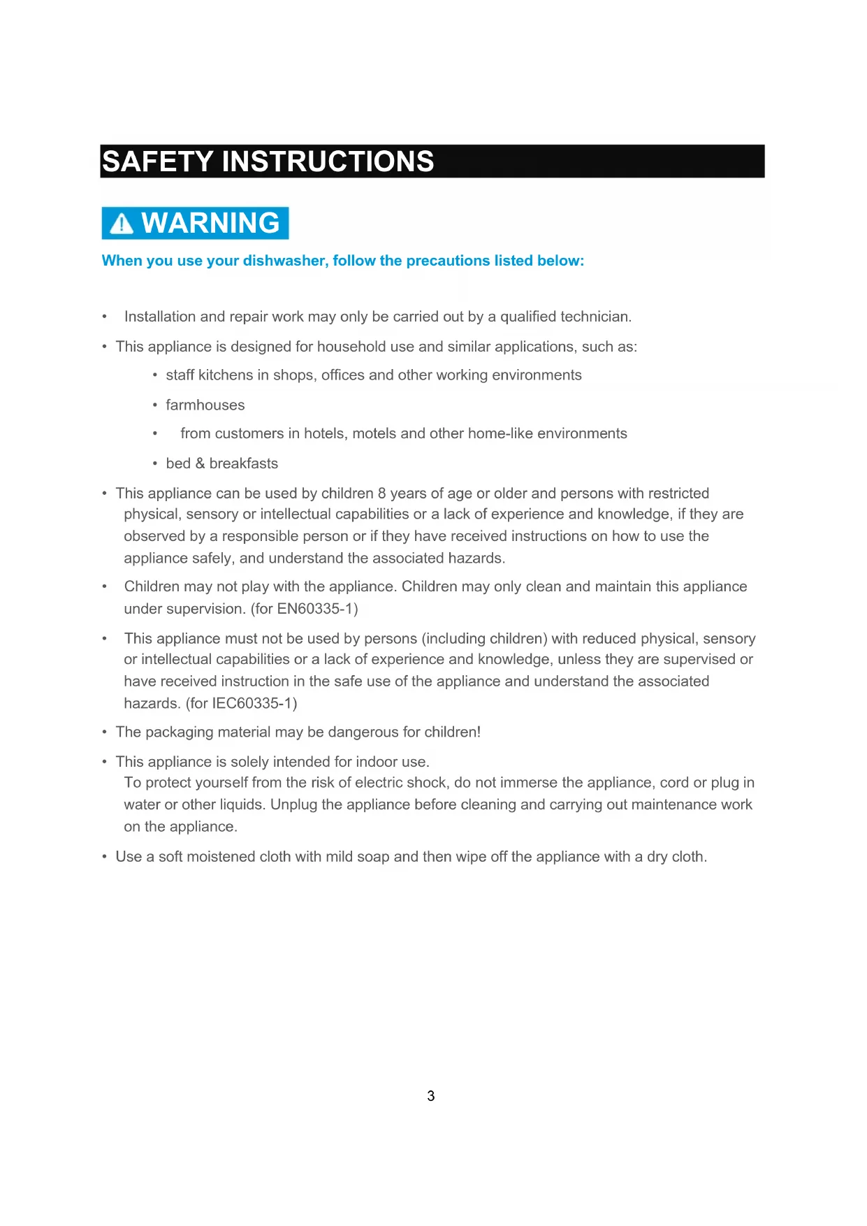 3 SAFETY INFORMATION 6 PRODUCT OVERVIEW 7 USING YOUR DISHWASHER 7 Filling salt into the water softener 9 Water softener 10 Preparing and loading dishes 13 Loading the basket 17 Tips for using the basket 19 Function of rinse aid and detergent 20 Filling the rinse aid container 21 Filling the dosing unit 22 USING YOUR DISHWASHER 22 Operating panel 24 PROGRAMMING THE DISHWASHER 24 Overview of wash cycles 26 Starting a wash cycle 26 Changing the programme during the wash cycle 27 Forgotten item 28 MAINTENANCE AND CLEANING 28 External care 28 Internal care 31 Dishwasher care2 32 INSTALLATION INSTRUCTIONS 32 Information on the power connection 33 Water supply and drainage 35 Connecting the drain hoses 36 Setting up the appliance 37 Installation 41 TROUBLESHOOTING TIPS 44 ERROR CODES 45 TECHNICAL INFORMATION3 SAFETY INSTRUCTIONS WARNING When you use your dishwasher, follow the precautions listed below: