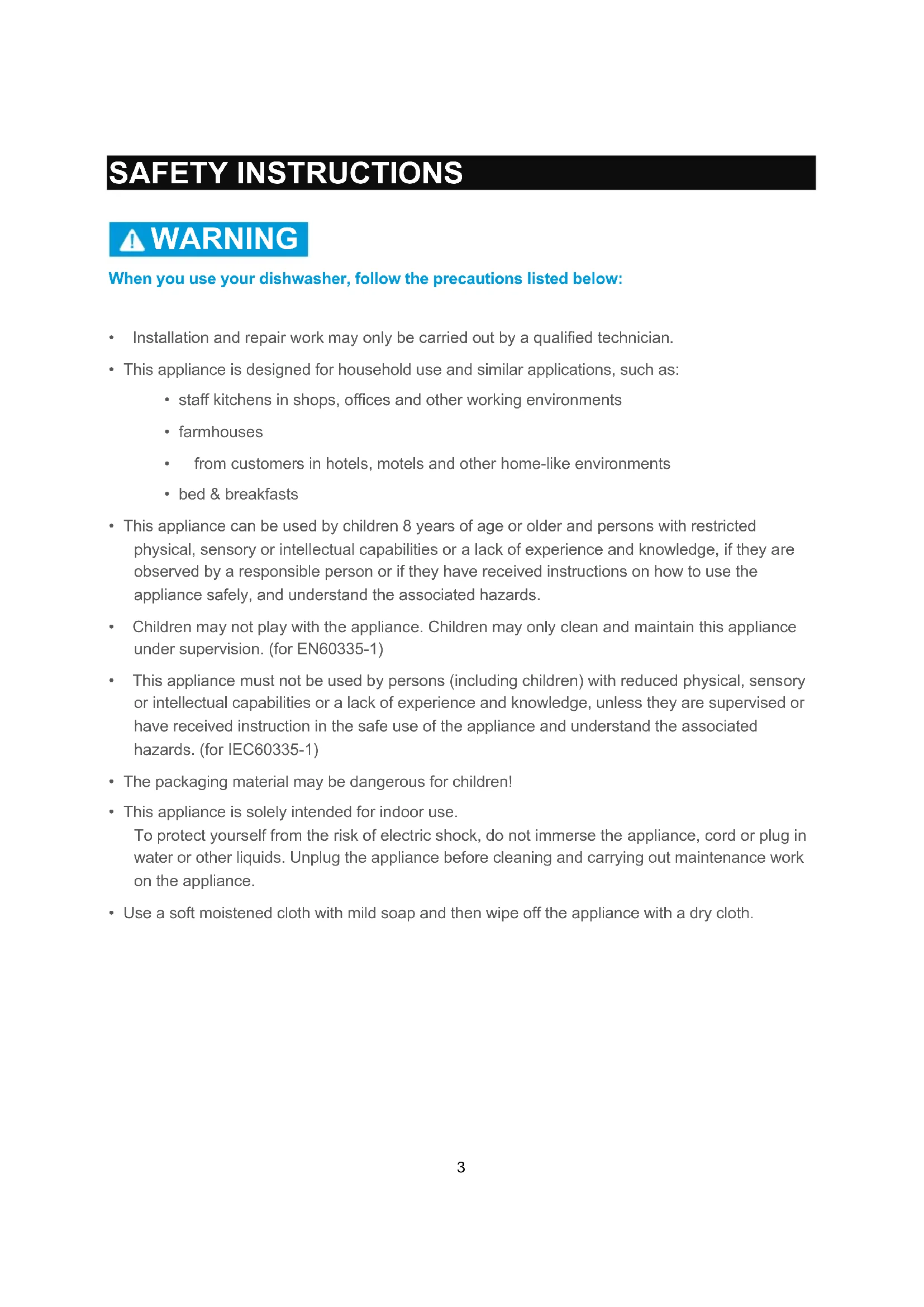 Children may not play with the appliance. Children may only clean and maintain this appliance under supervision. (for EN60335-1) - This appliance must not be used by persons (including children) with reduced physical, sensory or intellectual capabilities or a lack of experience and knowledge, unless they are supervised or have received instruction in the safe use of the appliance and understand the associated hazards. (for IEC60335-1)