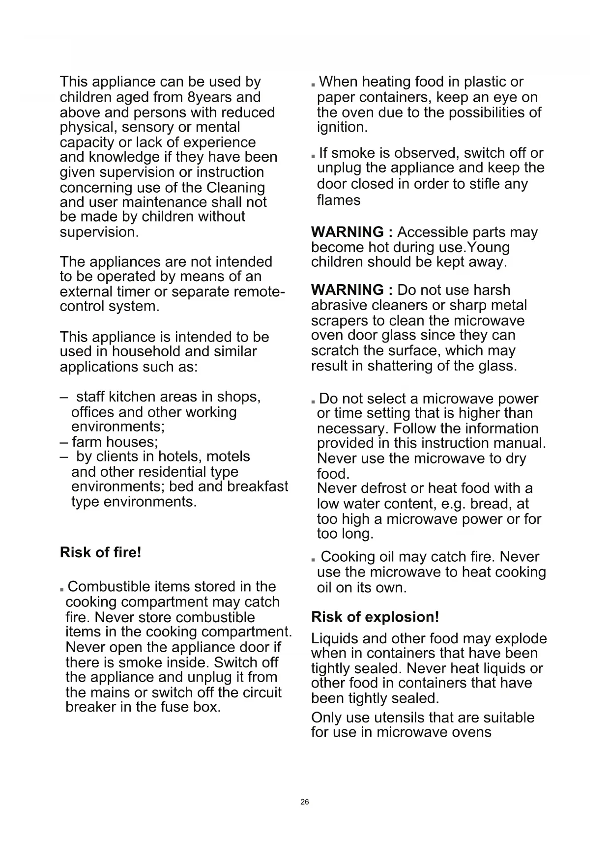 ■ Do not select a microwave power or time setting that is higher than necessary. Follow the information provided in this instruction manual. Never use the microwave to dry food. Never defrost or heat food with a low water content, e.g. bread, at too high a microwave power or for too long. ■ Cooking oil may catch re. Never use the microwave to heat cooking oil on its own. Risk of explosion! Liquids and other food may explode when in containers that have been tightly sealed. Never heat liquids or other food in containers that have been tightly sealed. Only use utensils that are suitable for use in microwave ovens27 Risk of serious damage to health! ■ The surface of the appliance may become damaged if it is not cleaned properly. Microwave energy may escape. Clean the appliance on a regular basis, and remove any food residue immediately. Always keep the cooking compartment, door seal, door and door stop clean; see also section Care and cleaning