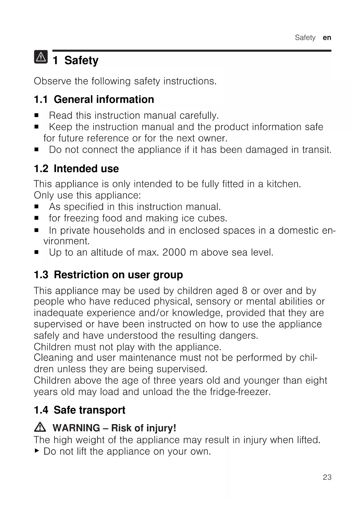 1 Safety Observe the following safety instructions. 1.1 General information ¡ Read this instruction manual carefully. ¡ Keep the instruction manual and the product information safe for future reference or for the next owner. ¡ Do not connect the appliance if it has been damaged in transit. 1.2 Intended use This appliance is only intended to be fully fitted in a kitchen. Only use this appliance: ¡ As specified in this instruction manual. ¡ for freezing food and making ice cubes. ¡ In private households and in enclosed spaces in a domestic en- vironment. ¡ Up to an altitude of max. 2000m above sea level. 1.3 Restriction on user group This appliance may be used by children aged 8 or over and by people who have reduced physical, sensory or mental abilities or inadequate experience and/or knowledge, provided that they are supervised or have been instructed on how to use the appliance safely and have understood the resulting dangers. Children must not play with the appliance. Cleaning and user maintenance must not be performed by chil- dren unless they are being supervised. Children above the age of three years old and younger than eight years old may load and unload the the fridge-freezer. 1.4 Safe transport WARNING‒Risk of injury! The high weight of the appliance may result in injury when lifted.