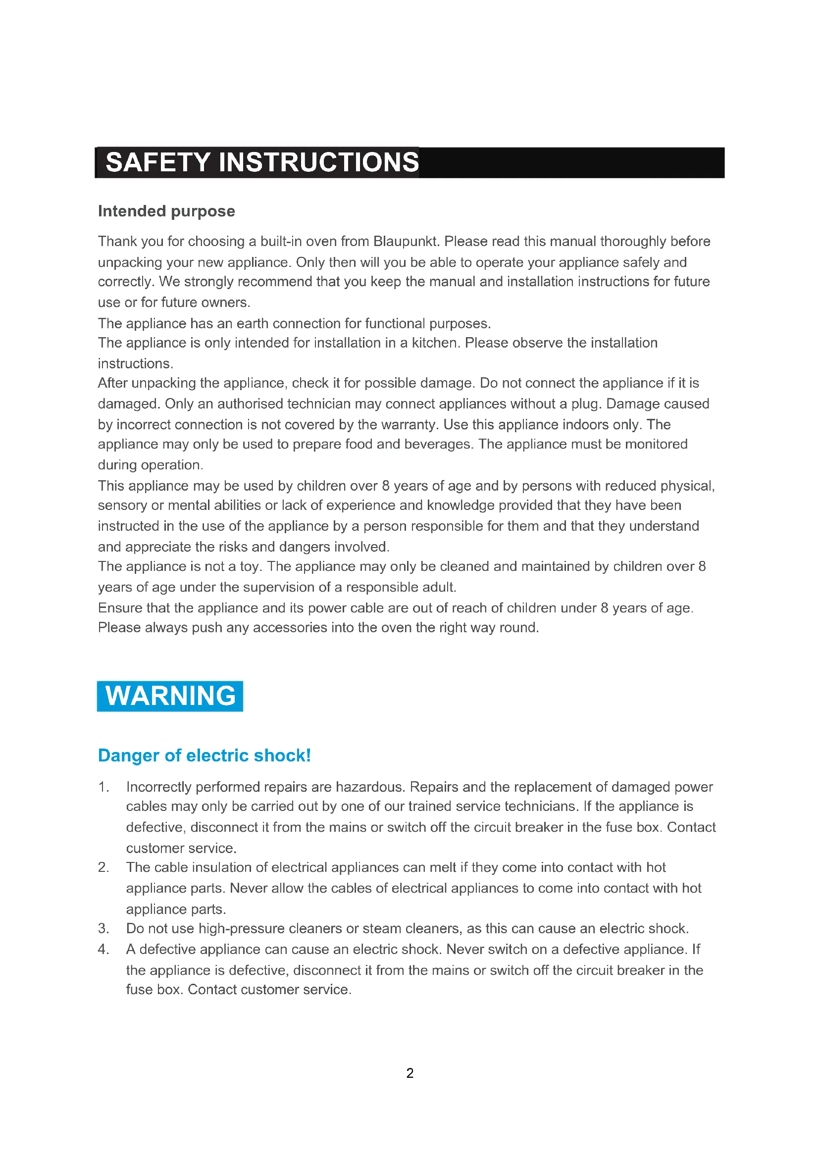 SAFETY INSTRUCTIONS Intended purpose Thank you for choosing a built-in oven from Blaupunkt. Please read this manual thoroughly before unpacking your new appliance. Only then will you be able to operate your appliance safely and correctly. We strongly recommend that you keep the manual and installation instructions for future use or for future owners. The appliance has an earth connection for functional purposes. The appliance is only intended for installation in a kitchen. Please observe the installation instructions. After unpacking the appliance, check it for possible damage. Do not connect the appliance if it is damaged. Only an authorised technician may connect appliances without a plug. Damage caused by incorrect connection is not covered by the warranty. Use this appliance indoors only. The appliance may only be used to prepare food and beverages. The appliance must be monitored during operation. This appliance may be used by children over 8 years of age and by persons with reduced physical, sensory or mental abilities or lack of experience and knowledge provided that they have been instructed in the use of the appliance by a person responsible for them and that they understand and appreciate the risks and dangers involved. The appliance is not a toy. The appliance may only be cleaned and maintained by children over 8 years of age under the supervision of a responsible adult. Ensure that the appliance and its power cable are out of reach of children under 8 years of age. Please always push any accessories into the oven the right way round.