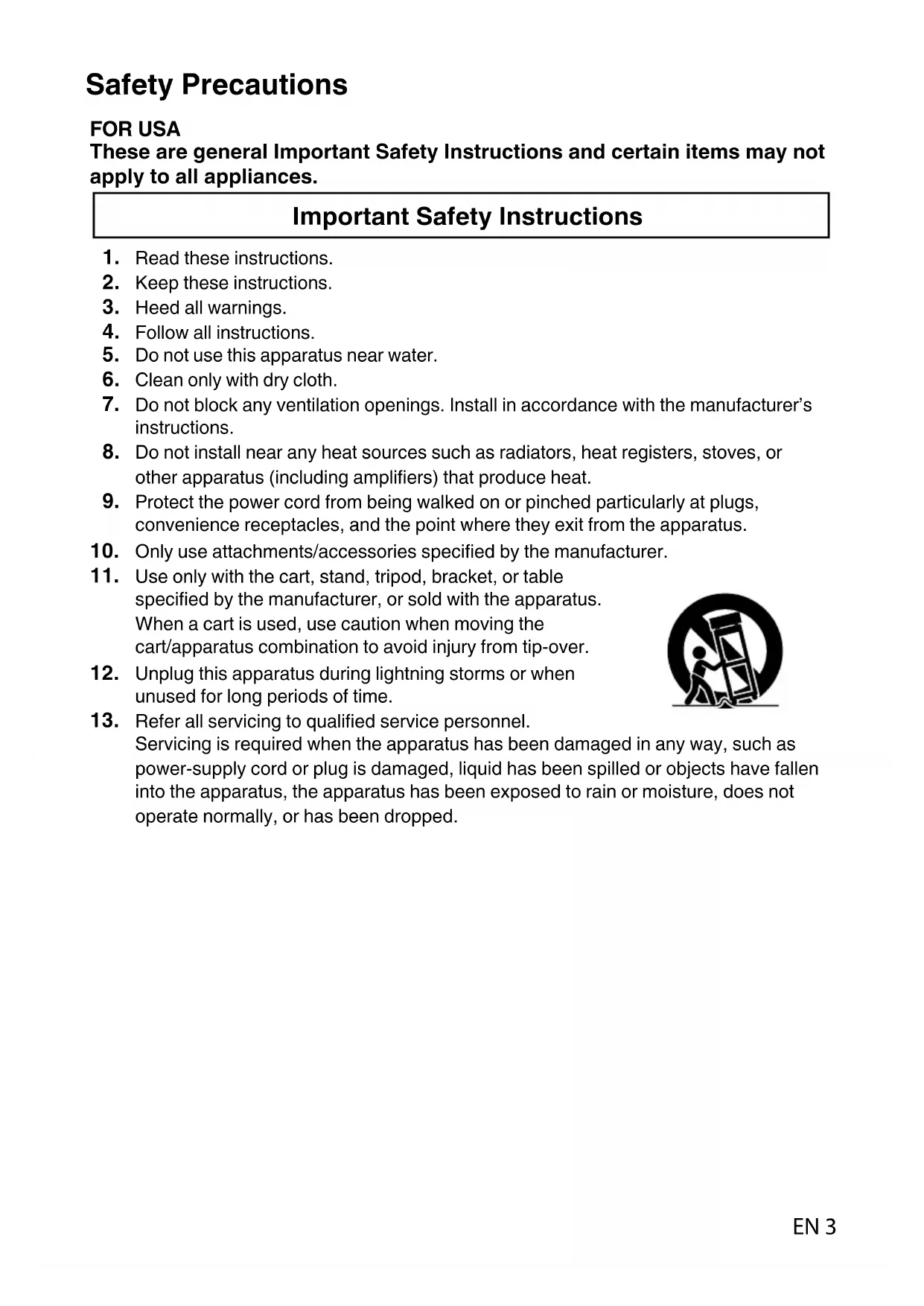 Heed all warnings. Follow all instructions. Do not use this apparatus near water. Clean only with dry cloth. Do not block any ventilation openings. Install in accordance with the manufacturer’s instructions. Do not install near any heat sources such as radiators, heat registers, stoves, or other apparatus (including amplifiers) that produce heat. Protect the power cord from being walked on or pinched particularly at plugs, convenience receptacles, and the point where they exit from the apparatus. Only use attachments/accessories specified by the manufacturer. Use only with the cart, stand, tripod, bracket, or table specified by the manufacturer, or sold with the apparatus. When a cart is used, use caution when moving the cart/apparatus combination to avoid injury from tip-over. Unplug this apparatus during lightning storms or when unused for long periods of time. Refer all servicing to qualified service personnel. Servicing is required when the apparatus has been damaged in any way, such as power-supply cord or plug is damaged, liquid has been spilled or objects have fallen into the apparatus, the apparatus has been exposed to rain or moisture, does not operate normally, or has been dropped. EN 3. CAUTION