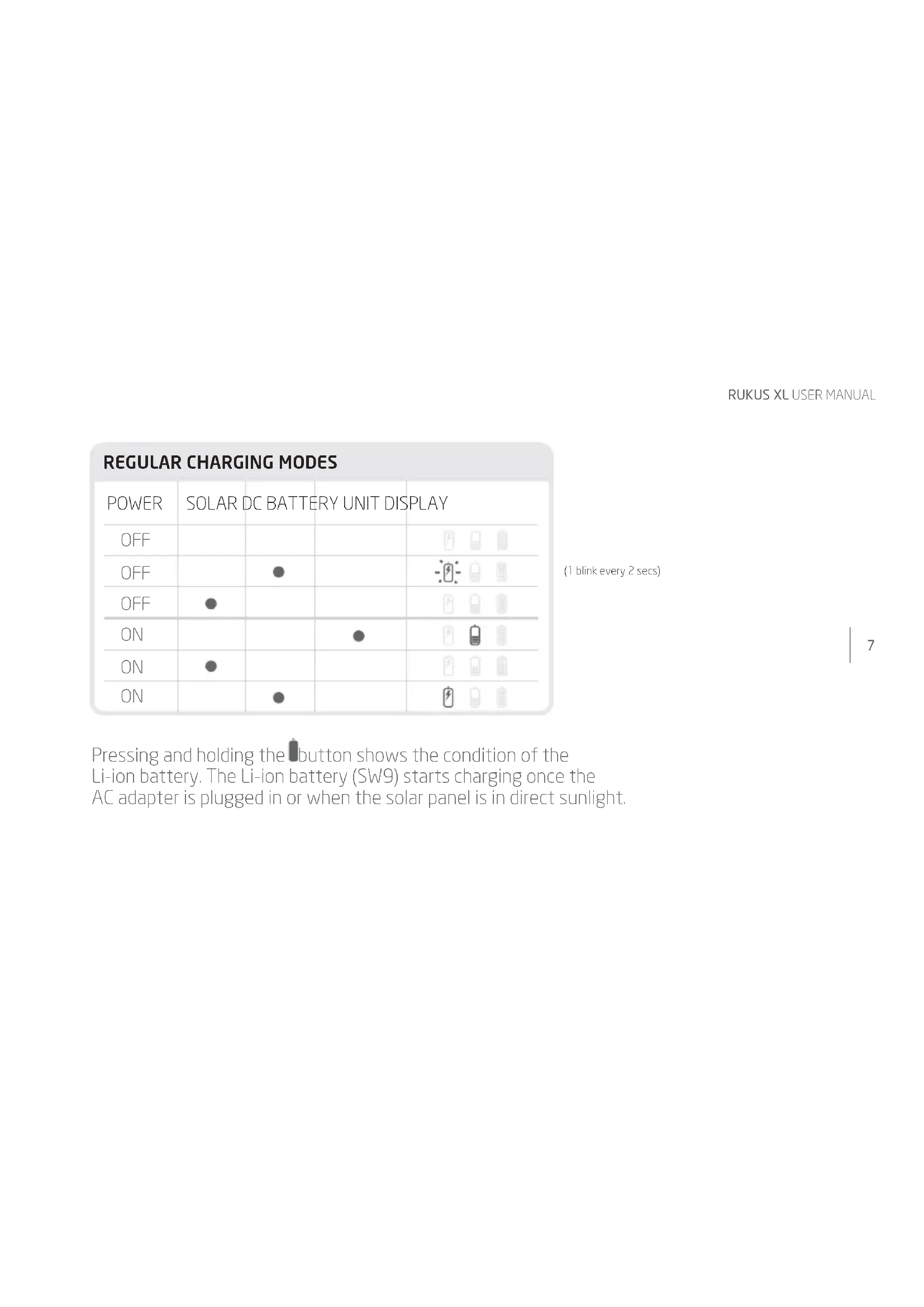 (1 blink every 2 secs) Pressing and holding the button shows the condition of the Li-ion battery. The Li-ion battery (SW9) starts charging once the AC adapter is plugged in or when the solar panel is in direct sunlight.EN English