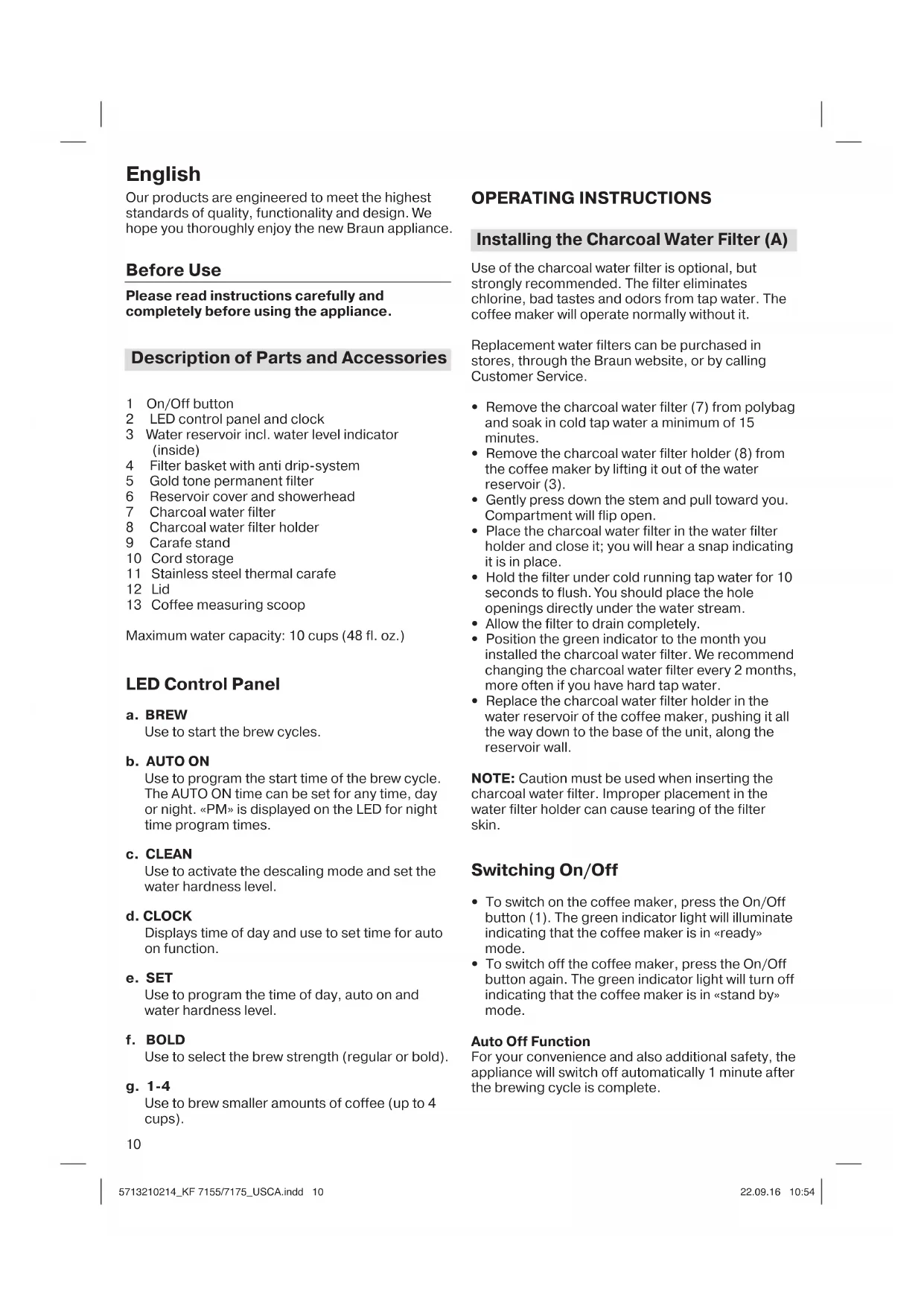 1 min. 1 min. Auto-off Auto-off 1 min.Auto-off 5713210214_KF 7155/7175_USCA.indd 95713210214_KF 7155/7175_USCA.indd 9 22.09.16 10:5422.09.16 10:5410 English Our products are engineered to meet the highest standards of quality, functionality and design. We hope you thoroughly enjoy the new Braun appliance. Before Use Please read instructions carefully and completely before using the appliance. Description of Parts and Accessories 1 On/Off button 2 LED control panel and clock 3 Water reservoir incl. water level indicator (inside) 4 Filter basket with anti drip-system 5 Gold tone permanent filter 6 Reservoir cover and showerhead 7 Charcoal water filter 8 Charcoal water filter holder 9 Carafe stand 10 Cord storage 11 Stainless steel thermal carafe 12 Lid 13 Coffee measuring scoop Maximum water capacity: 10 cups (48 fl. oz.) LED Control Panel a. BREW Use to start the brew cycles. b. AUTO ON Use to program the start time of the brew cycle. The AUTO ON time can be set for any time, day or night. «PM» is displayed on the LED for night time program times. c. CLEAN Use to activate the descaling mode and set the water hardness level. d. CLOCK Displays time of day and use to set time for auto on function. e. SET Use to program the time of day, auto on and water hardness level. f. BOLD Use to select the brew strength (regular or bold). g. 1-4 Use to brew smaller amounts of coffee (up to 4 cups). OPERATING INSTRUCTIONS Installing the Charcoal Water Filter (A) Use of the charcoal water filter is optional, but strongly recommended. The filter eliminates chlorine, bad tastes and odors from tap water. The coffee maker will operate normally without it. Replacement water filters can be purchased in stores, through the Braun website, or by calling Customer Service.
